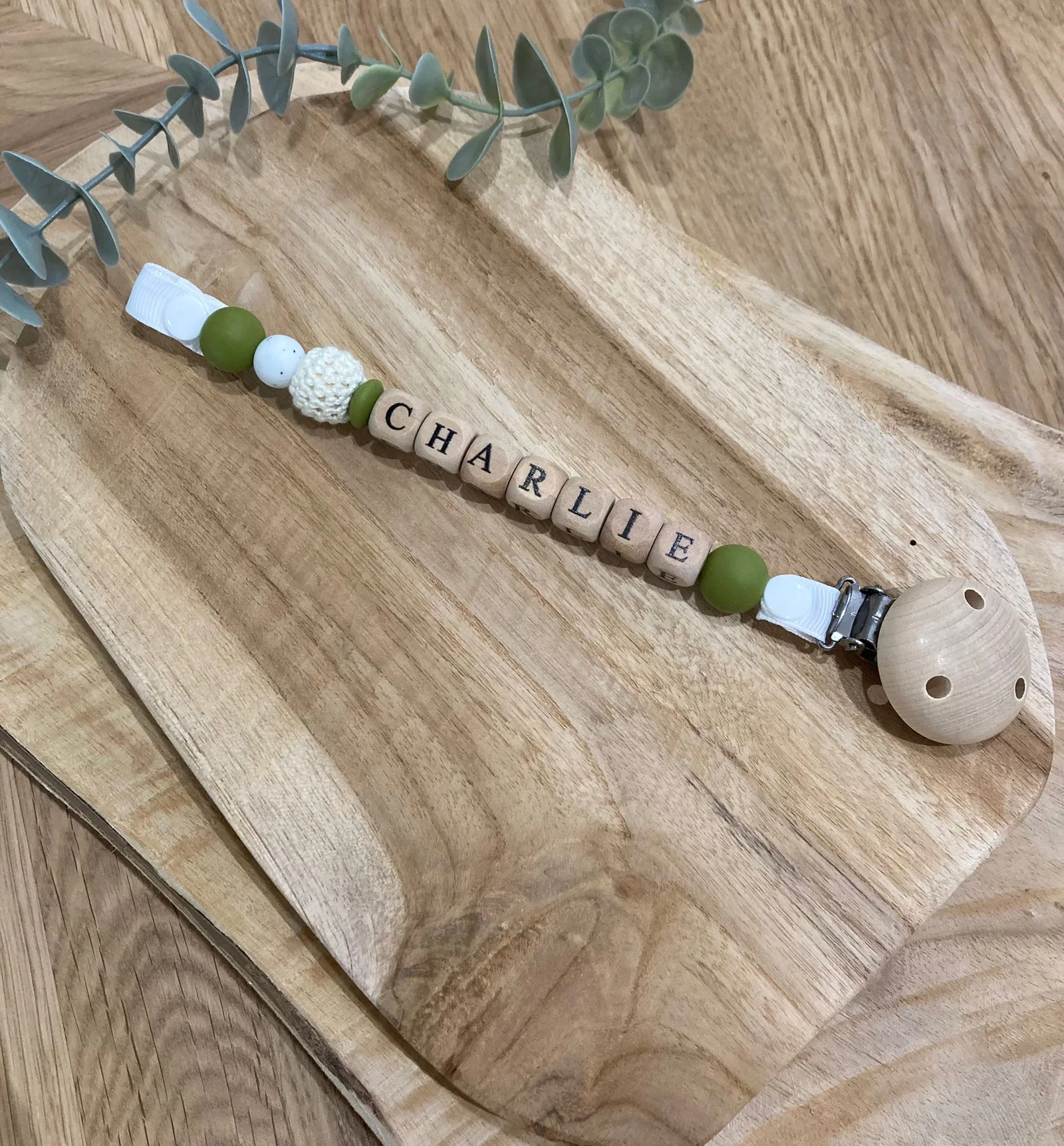 Attache tétine vert olive et blanc granité