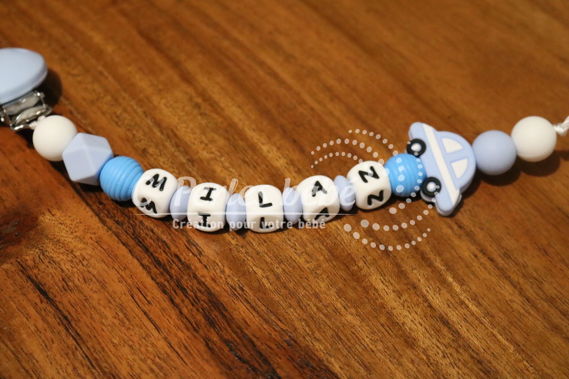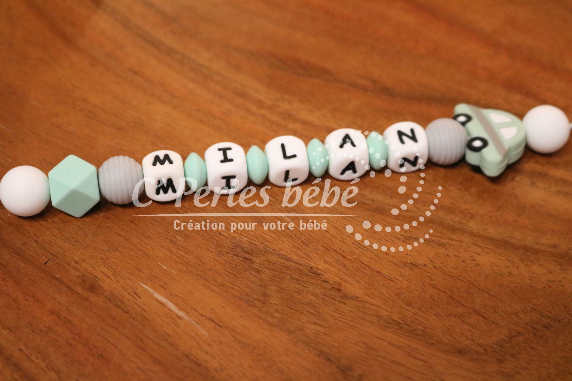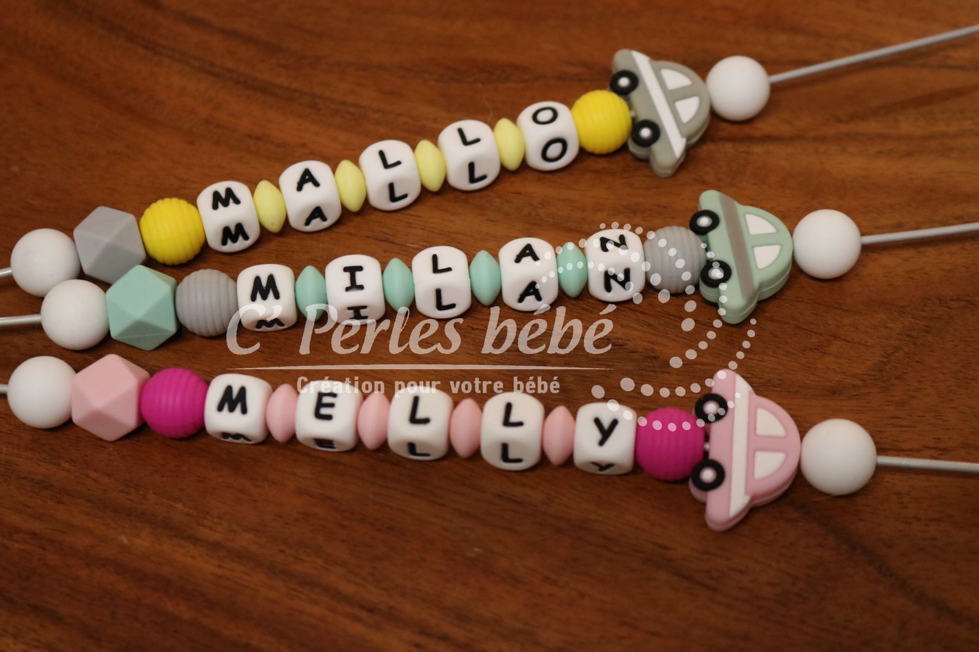 Ce modèle 100% silicone comporte des perles lettres (prénom de votre enfant) séparé de perles plates.