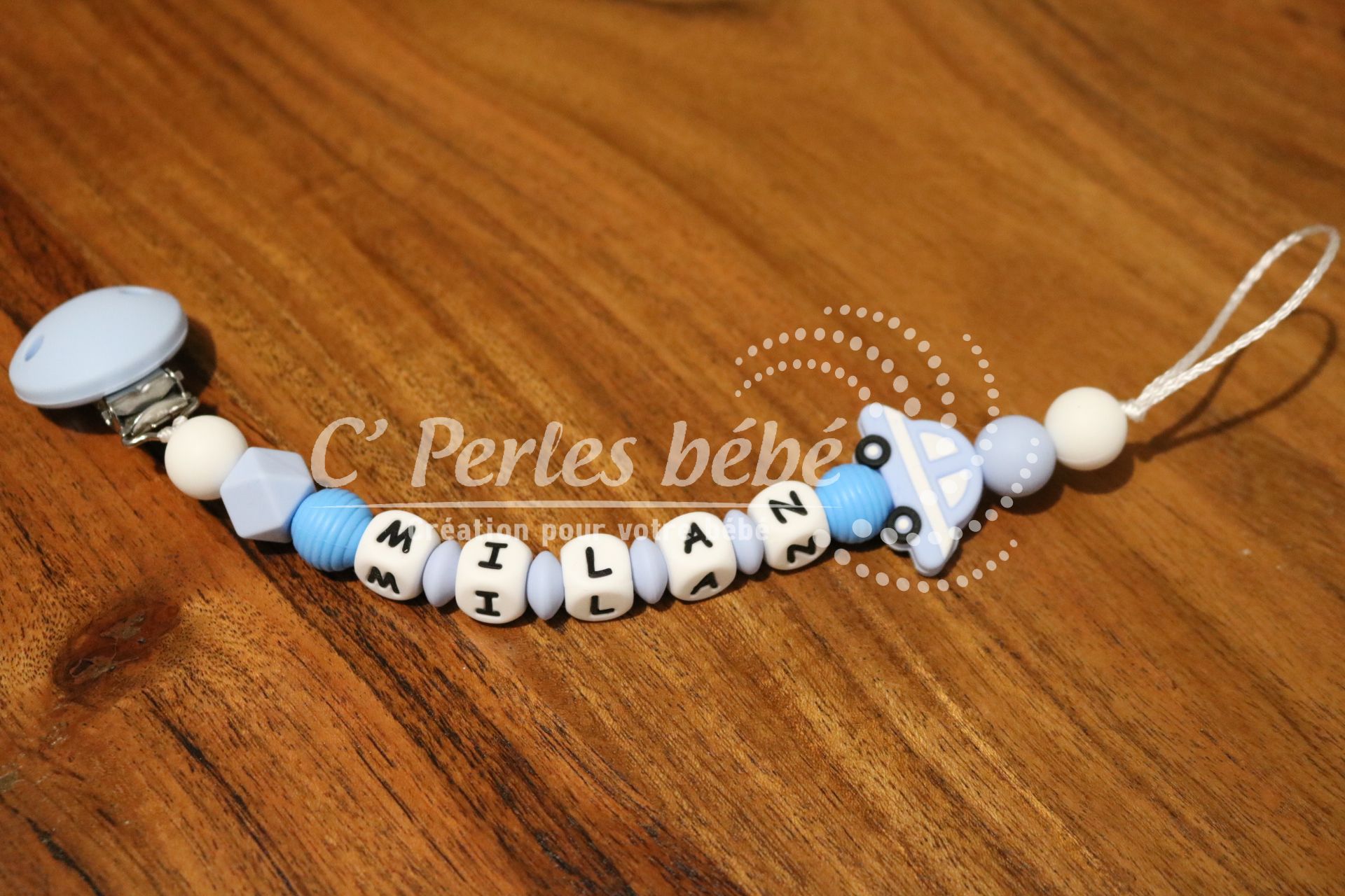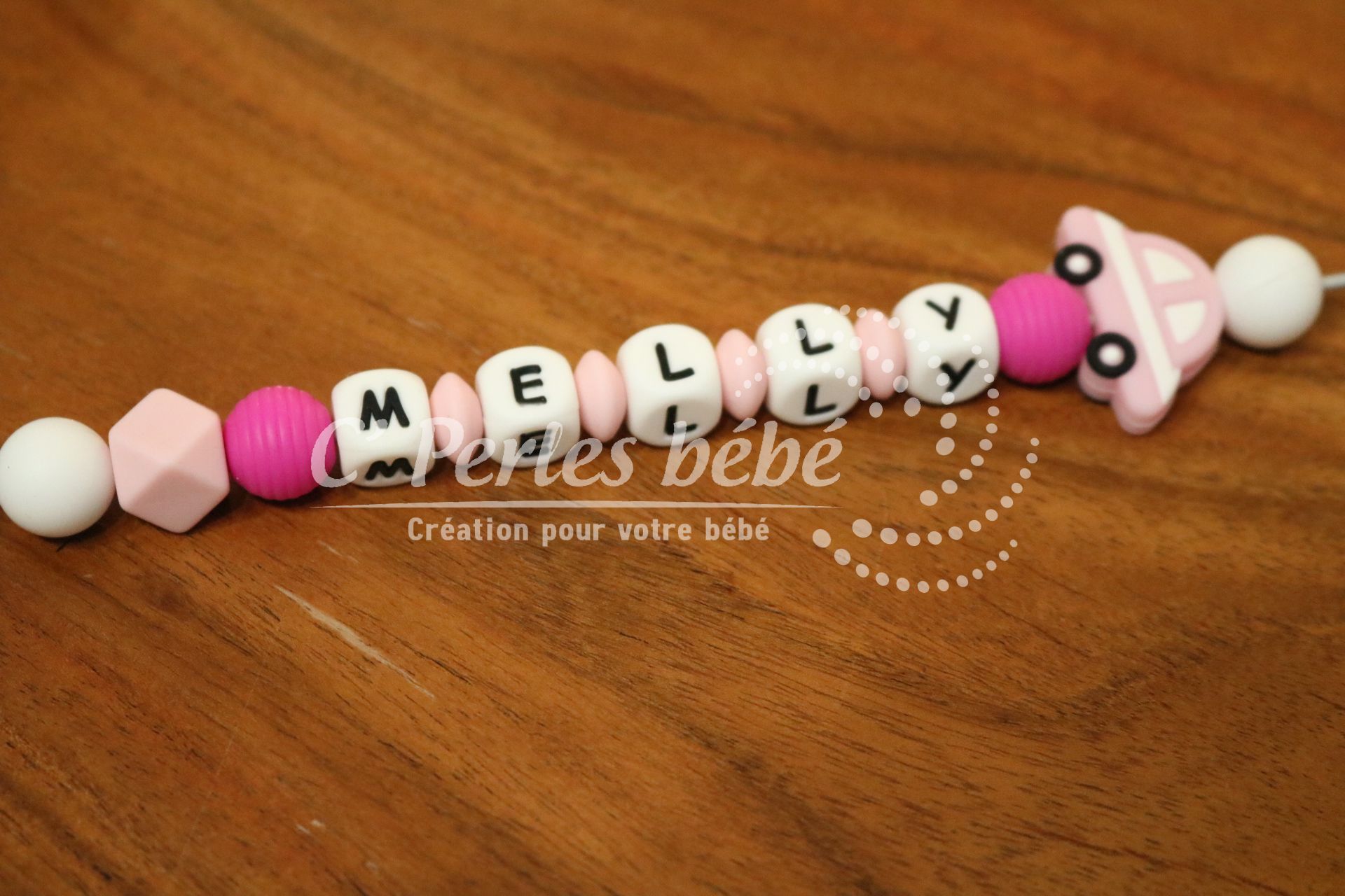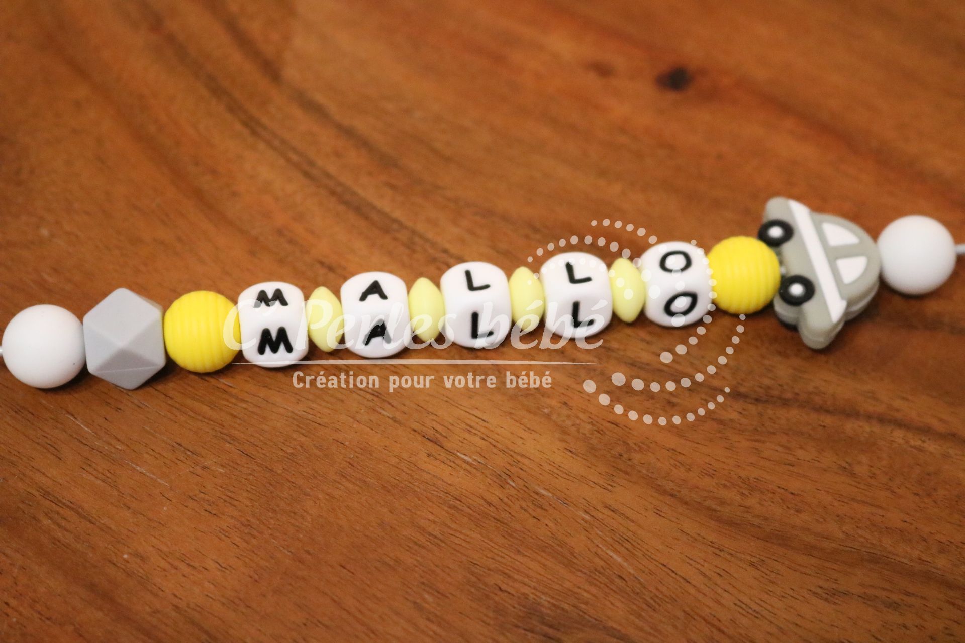 Ce modèle 100% silicone comporte des perles lettres (prénom de votre enfant) séparé de perles plates.