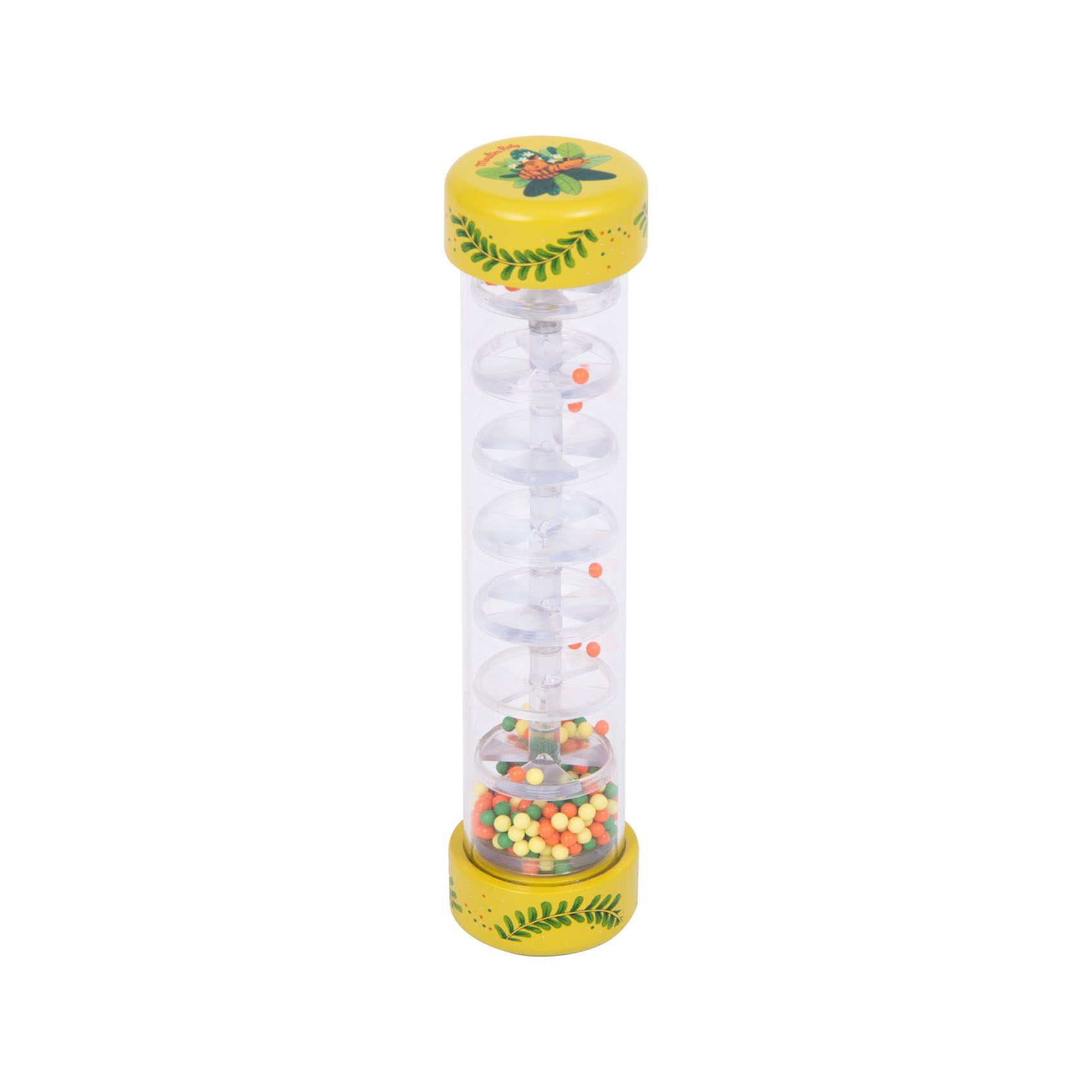 Ce bâton de pluie en plastique avec petites billes colorées est très facile à utiliser. Retournez le bâton et écoutez le doux son de la pluie, pour le plaisir des yeux et des oreilles. Il permet un premier éveil à la musique en douceur en stimulant l’ouïe et la vue. C’est un jeu d’éveil original et captivant. Il est décoré de feuilles et d’animaux de la jungle.