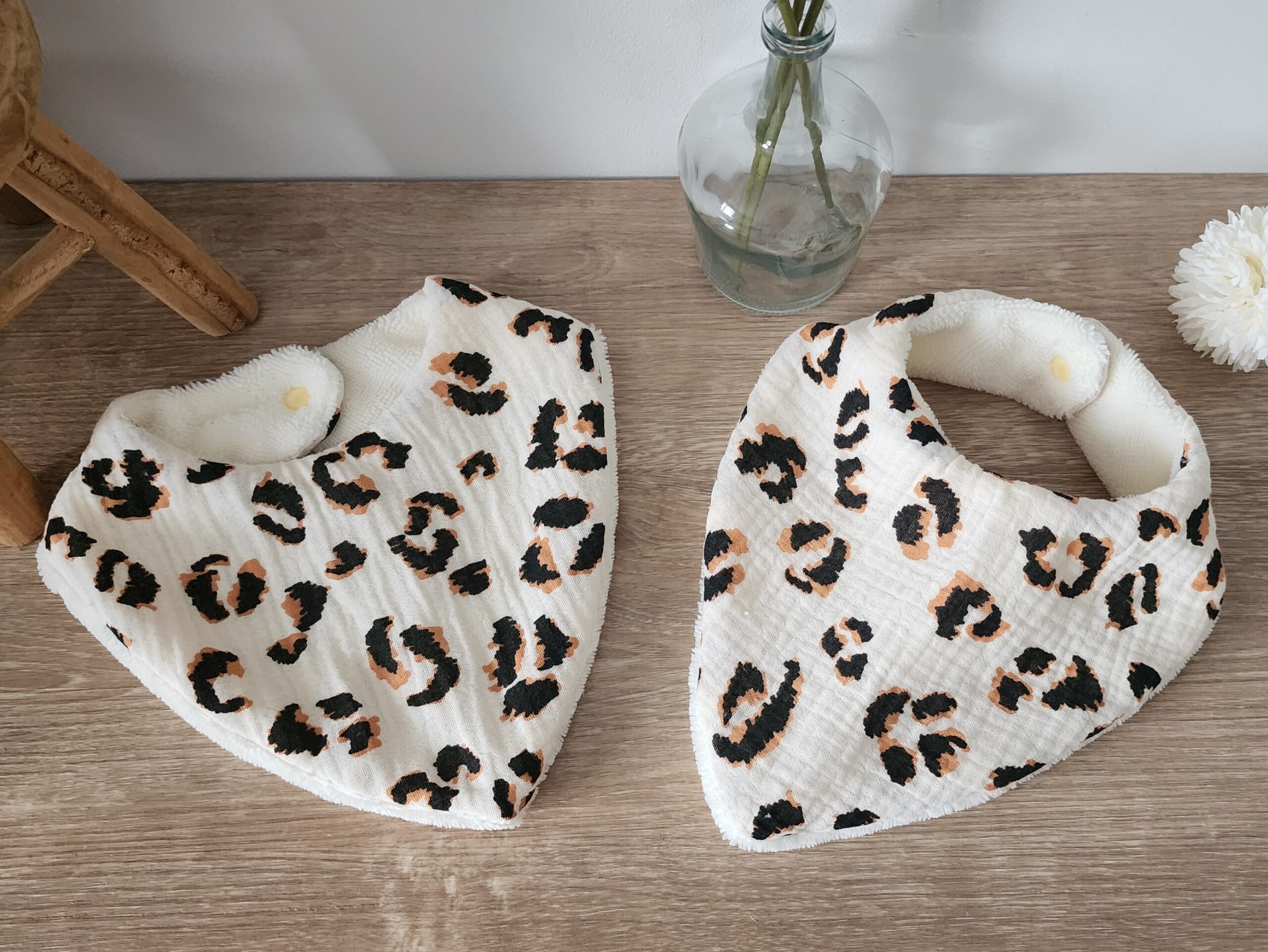 Bavoir bandana bébé personnalisé tissu double gaze léopard et éponge bambou écru