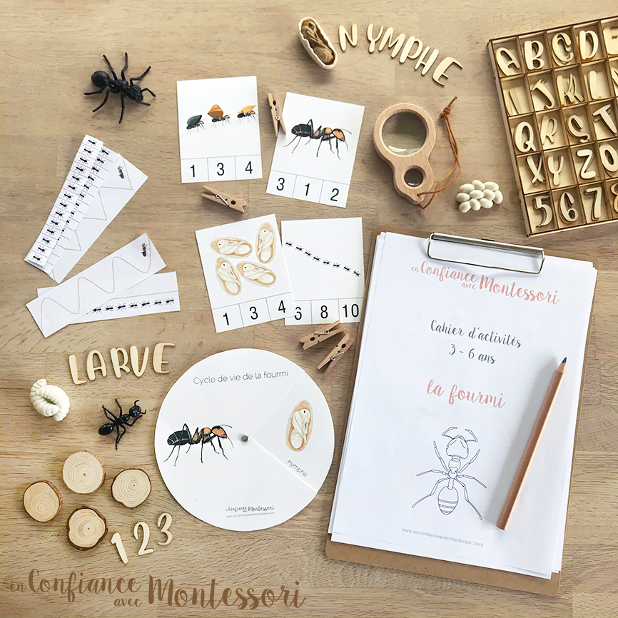 Ce cahier d’activités sur le thème de la fourmi comprend plus d’une vingtaine de pages d’activités inspirées de la pédagogie Montessori pour les enfants de 3 à 7 ans. Vous y trouverez des exercices comme couper ou plier du papier, tracer des graphismes ou colorier. L’enfant pourra s’exercer à tracer des lettres en cursive et lire différents types d’écriture. Vous y trouverez une douzaine de cartes à pince pour compter jusqu’à 10, mais aussi des exercices de mathématiques, une roue sur le cycle de vie de la fourmi et d’autres choses à réaliser seul ou avec un peu d’aide.