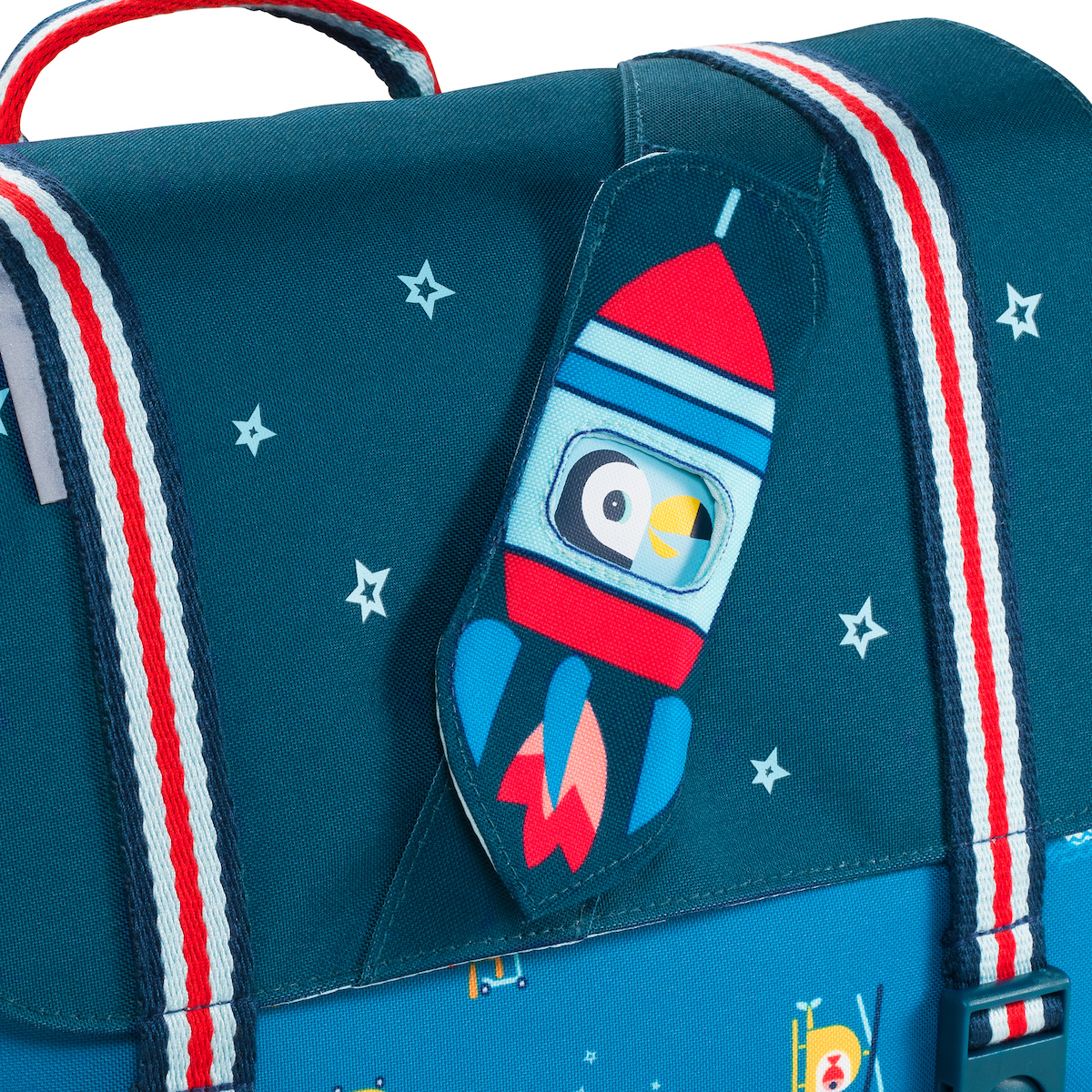 Pour créer des liens dans l’univers, les petits cosmonautes utilisent les détails cachés dans ce cartable100% PET recycled : en faisant coulisser la fusée, on peut montrer si on est triste, content ou fâché.
