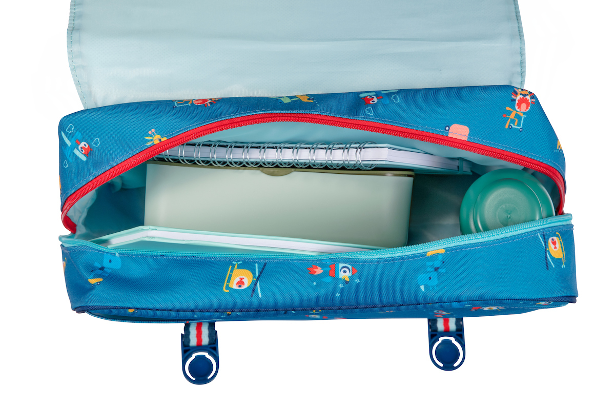Egalement porté sur le dos ou à la main, Il est idéal pour ranger le goûter, la gourde et les mille et un petits autres objets pour l’école.