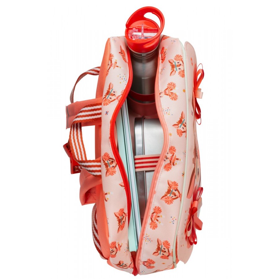 Ce cartable à l’effigie de Stella le faon est doté d’un grand compartiment de rangement zippé pouvant accueillir des cahiers au format A4, une gourde ou encore un doudou. Il y a également une poche de rangement pour un carnet de liaison ou un goûter. Bien conçu, il dispose d’un élastique maintenant droite une gourde d’une capacité maximale de 600 mL.