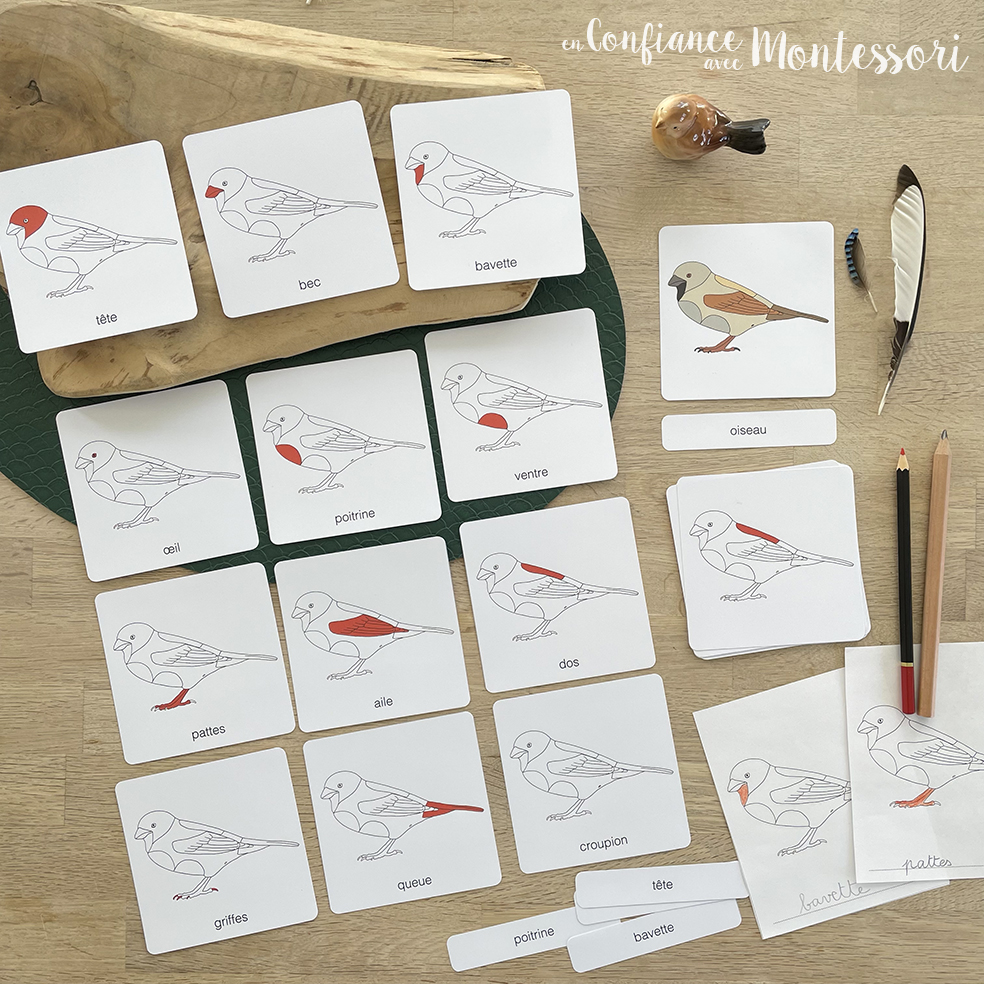 Ce fichier comprend un ensemble de cartes de nomenclature Montessori sur les parties de l’oiseau présentant 12 mots de vocabulaire. Ce matériel est destiné aux enfants de 3 à 7 ans.