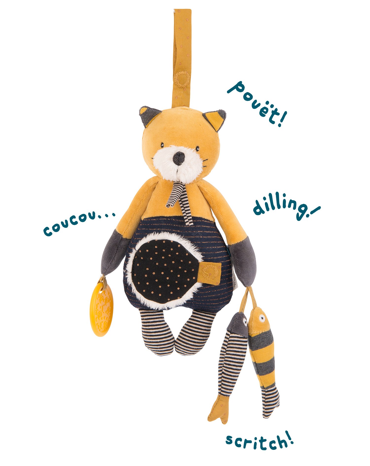 Lulu le chat des Moustaches de Moulin Roty a tout ce qu’il faut pour amuser bébé ! Il transporte une spatule dentaire, des sardines avec papier crissant et surprise… un miroir caché dans sa combinaison ! Il s’accroche partout grâce à son lien, et fait gling-gling quand on le secoue !