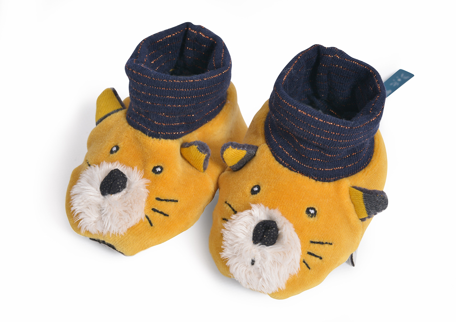 Des chaussons en tissu tout doux pour les pieds de bébé. Souples et confortables, ils ont été conçus avec une tirette à l’arrière pour que ça soit simple à enfiler et à retirer pour les parents. De couleur moutarde, ils représentent un chat avec un museau en fourrure toute douce et de jolies moustaches cousues. La partie chaussette est en lurex cuivré et gardera les chevilles de bébé bien au chaud. Le dessous du chausson révèle un joli jersey rayé noir et blanc. Ils sont assortis à Lulu le chat de la collection Les Moustache par Moulin Roty.
