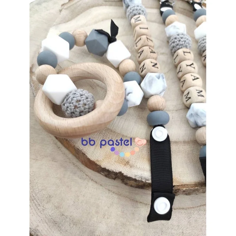 Coffret duo : Attache tétine + Anneau de dentition assortis: Modèle simple d’utilisation: L’attache tétine s’attache à l’anneau de la tétine grâce à un système de boutons pression. Les attaches peuvent être mises à la bouche par les bébés, cela n’évite néanmoins pas la vigilance des parents lors de l’utilisation de ce produit. Les formes et textures différentes éveillent les sens des bébés dés la naissance. Attention: Les prénoms au dessus de 7 lettres ne sont pas acceptés !!! le nombre de perles change en fonction du nombre de lettres dans le prénom. Anneau de dentition – hochet conçu spécialement pour les bébés. Conformes aux normes…