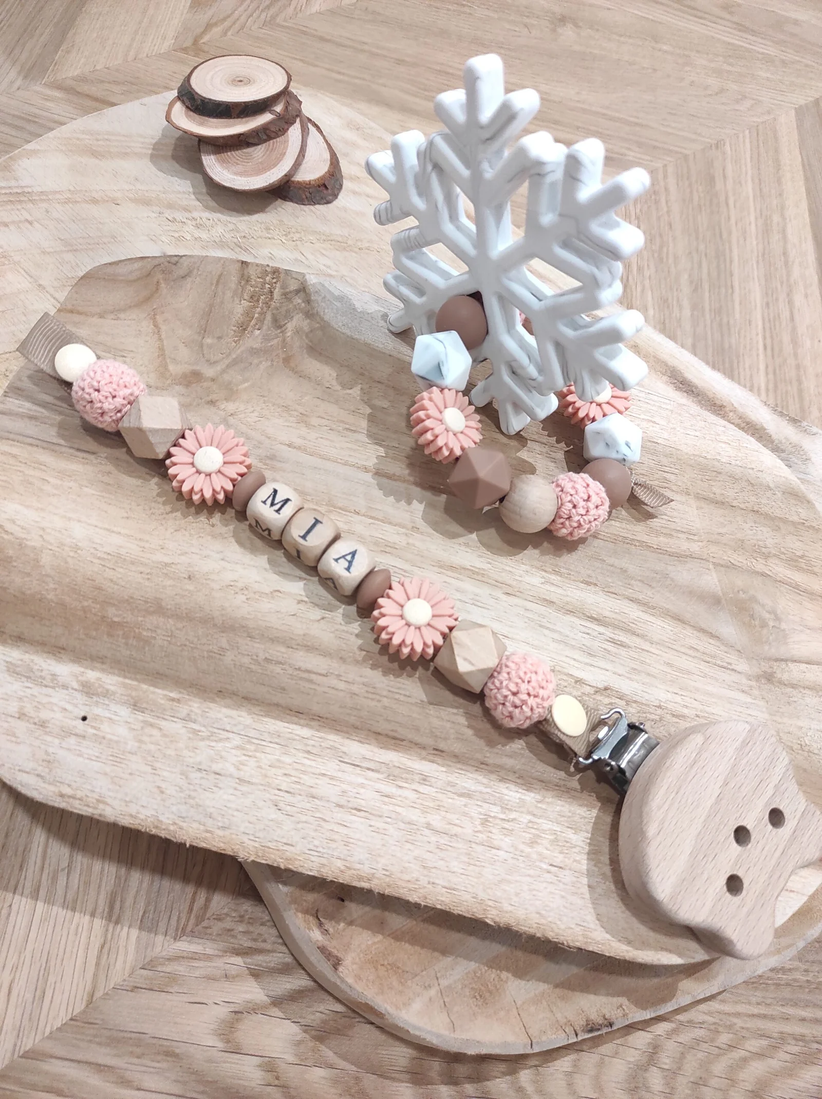 Coffret duo : Attache jouet + Anneau de dentition assortis: Modèle simple d’utilisation: L’attache jouet s’attache à l’anneau de la tétine grâce à un système de boutons pression. Les attaches peuvent être mises à la bouche par les bébés, cela n’évite néanmoins pas la vigilance des parents lors de l’utilisation de ce produit. Les formes et textures différentes éveillent les sens des bébés dés la naissance. Attention: Les prénoms au dessus de 7 lettres ne sont pas acceptés !!! le nombre de perles change en fonction du nombre de lettres dans le prénom. Anneau de dentition – hochet conçu spécialement pour les bébés. Conformes aux…