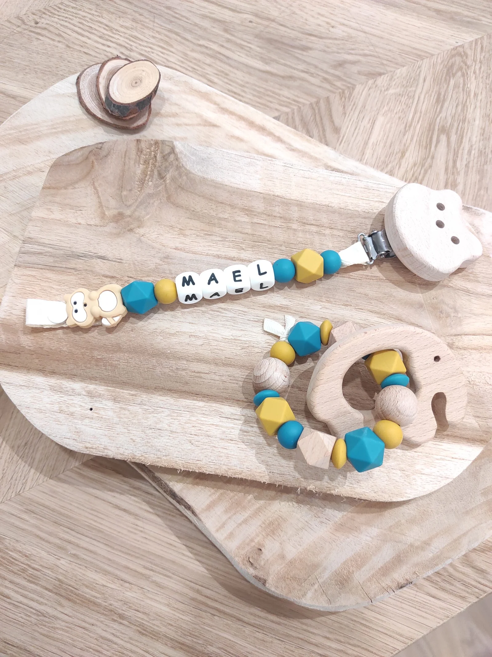 Coffret duo : Attache jouet + Anneau de dentition assortis: Modèle simple d’utilisation: L’attache jouet s’attache à l’anneau de la tétine grâce à un système de boutons pression. Les attaches peuvent être mises à la bouche par les bébés, cela n’évite néanmoins pas la vigilance des parents lors de l’utilisation de ce produit. Les formes et textures différentes éveillent les sens des bébés dés la naissance. Attention: Les prénoms au dessus de 7 lettres ne sont pas acceptés !!! le nombre de perles change en fonction du nombre de lettres dans le prénom. Anneau de dentition – hochet conçu spécialement pour les bébés. Conformes aux…