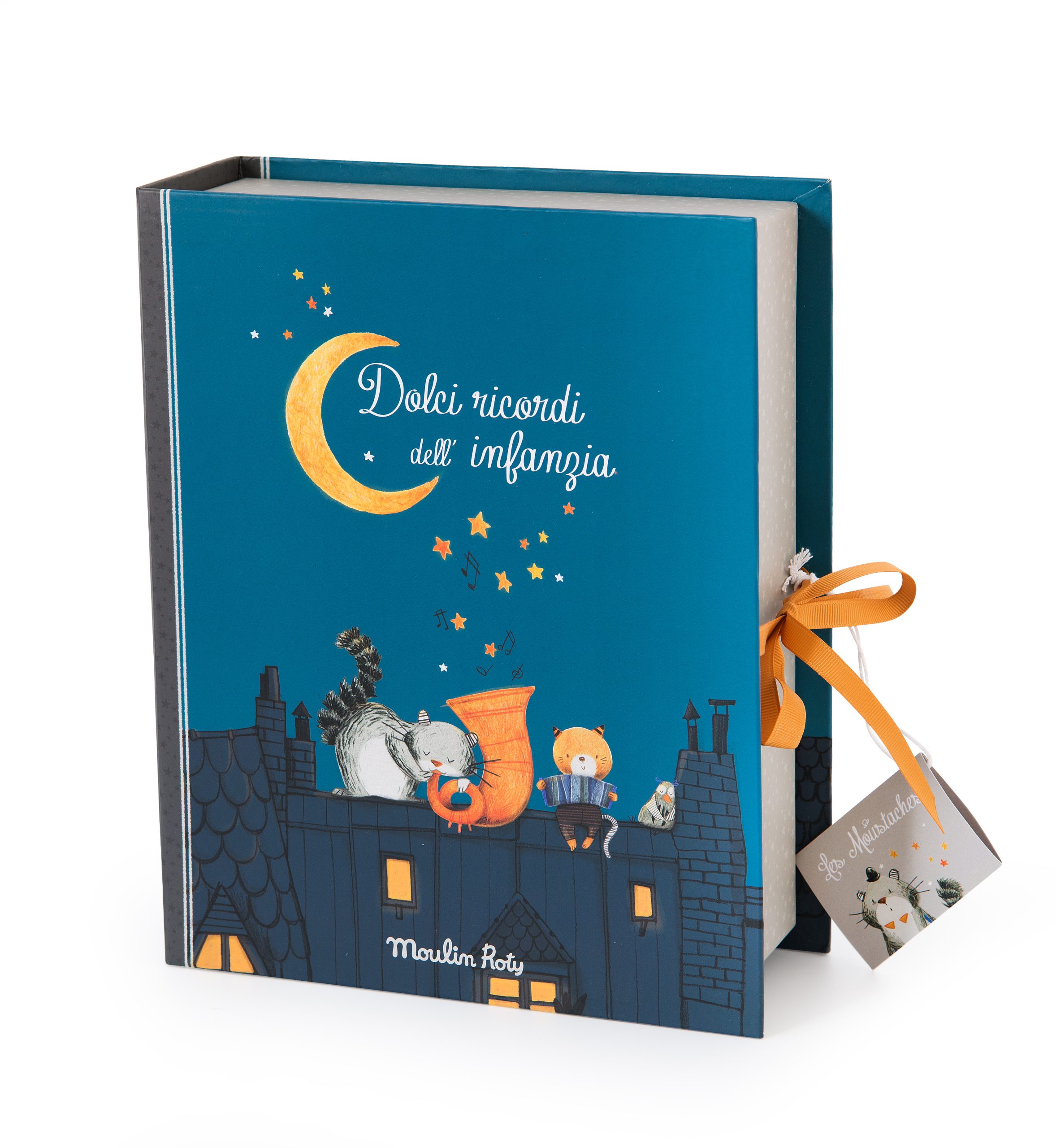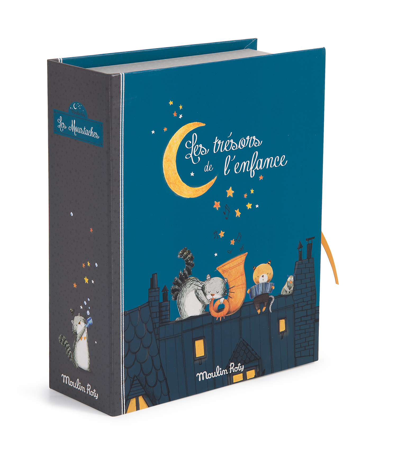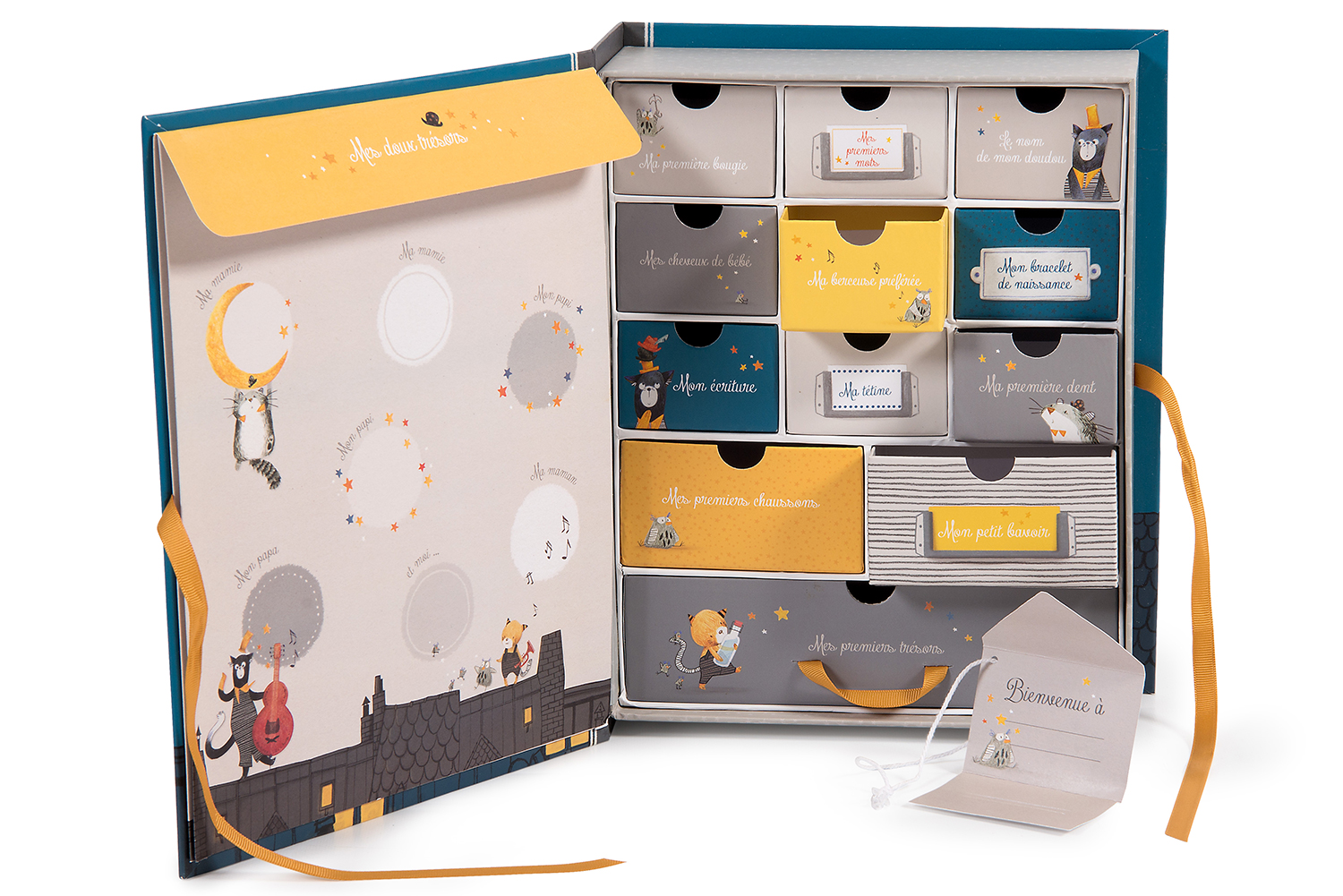 Le Coffret naissance permet aux parents de ranger dans chacun des tiroirs toutes les douceurs de l’enfance. Il est décoré de tous les personnages de la collection « les moustaches ». Il se referme grâce à un ruban et une petite cartonnette en forme d’enveloppe permet d’y écrire son nom. Vous y retrouverez les tiroirs « Ma Première Bougie », « Mes Premiers Mots », « Le Nom de mon Doudou », « Mes Cheveux de bébé », « Ma Berceuse préférée », « Mon Bracelet de Naissance », « Mon Écriture », « Ma Tétine », « Ma Première Dent », « Mes Premiers Chaussons », « Mon Petit Bavoir » et « Mes Premiers Trésors ». Vous pouvez aussi y coller les photos de la famille de l’enfant.