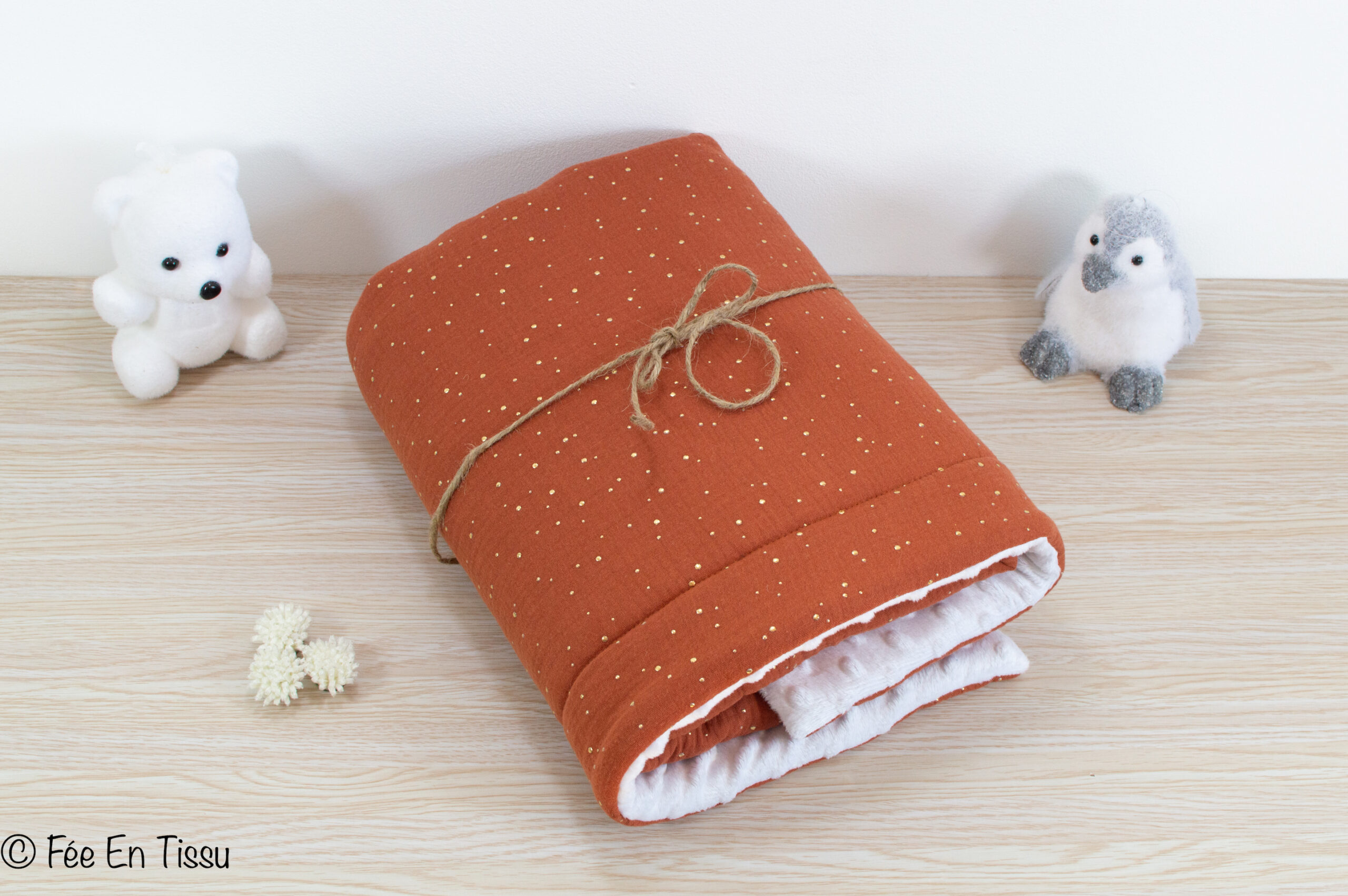 Couverture bébé personnalisée gaze de coton, minky, terracotta à pois doré