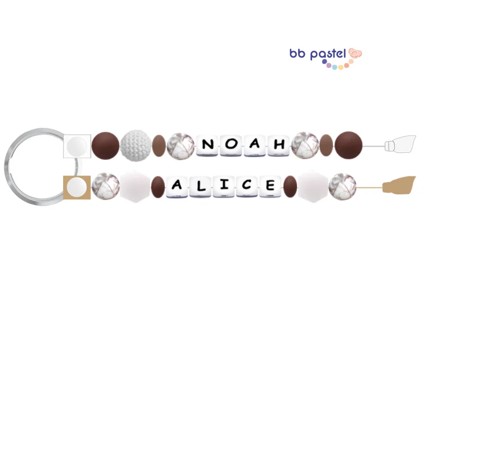 Avec le configurateur BB Pastel, sélectionne jusqu’à 2 prénoms ou mots courts, choisis la gamme de perles silicone alimentaire, ajoute des textures (perles lisses, crantées, lettres) et complète avec un clip adapté. En quelques étapes simples, tu obtiens un design personnel, prêt à personnaliser ton quotidien.