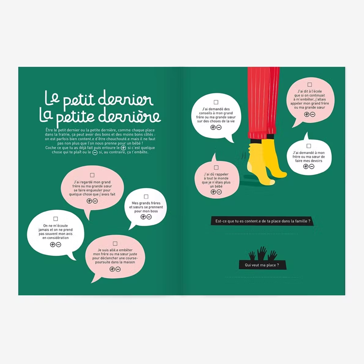 Quelle chance d’avoir des frères et sœurs ! Un jour, on se dit des horreurs, le lendemain, on pouffe de rire. Voici un livre à remplir ensemble pour s’étonner de ses différences, se lâcher sur les parents, se plaindre un peu et surtout prendre conscience de ce que chacun apporte à la famille . Idéal pour renforcer les liens de la fratrie.
