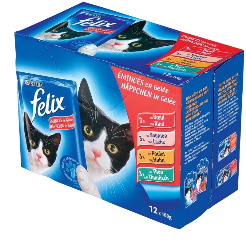 Felix Emincés en Gelée Assortis en Boite de 12 Pièces de 100 gr 3x au Thon 3x au Bœuf 3x au Poulet 3x au Saumon