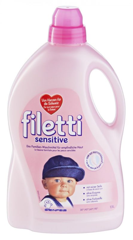 Filetti Sensitive, la lessive numéro 1 en Suisse pour les peaux sensibles*Filetti Sensitive Gel, la lessive familiale pour les peaux sensibles : faite à base de savon pur d’huiles parfumées compatibles avec la peau, sans enzymes et sans colorants. Pour une protection optimale de la peau, Filetti Sensitive est également disponible sous forme de gel – bien sûr avec la qualité habituelle Filetti.