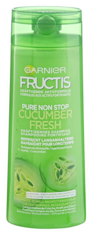 Les nouvelles formules Fructis sans paraben au concentré d’actifs fortifiants de fruits. Une combinaison exclusive à l’efficacité prouvée d’extraits dérivés de fruits et de plantes, de vitamines B3 et B6 et de protéine de citron*. Pour des cheveux plus sains, plus forts. Fructis associe dans sa formule sans silicone et parabène le concombre à des agents purifiants pour renforcer et purifier plus longtemps les cheveux et le cuir chevelu. Résultat: le cuir chevelu est purifiéé, les cheveux frais pour longtemps, plus forts et plus brillants.Renseignements pratiquesNos formules offrent efficacité, plaisir d’utilisation et respect. Elles sont adaptées à un usage quotidien. En cas de contact avec les yeux, les rincer immédiatement.