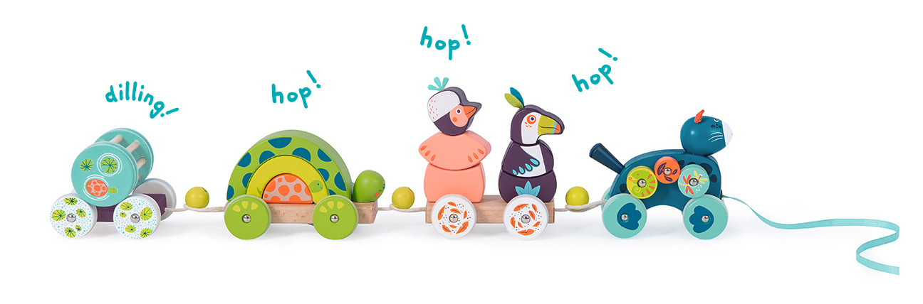 Le train est prêt à partir… en avant ! Grand train d’activités en bois de la collection Dans la jungle de Moulin Roty, composé de différents wagons rigolos : la panthère bleue et ses roulettes, le toucan, l’oiseau et la tortue empilables, et la boîte hochet à boule et grelot. Ce train à tirer incite bébé à la marche.