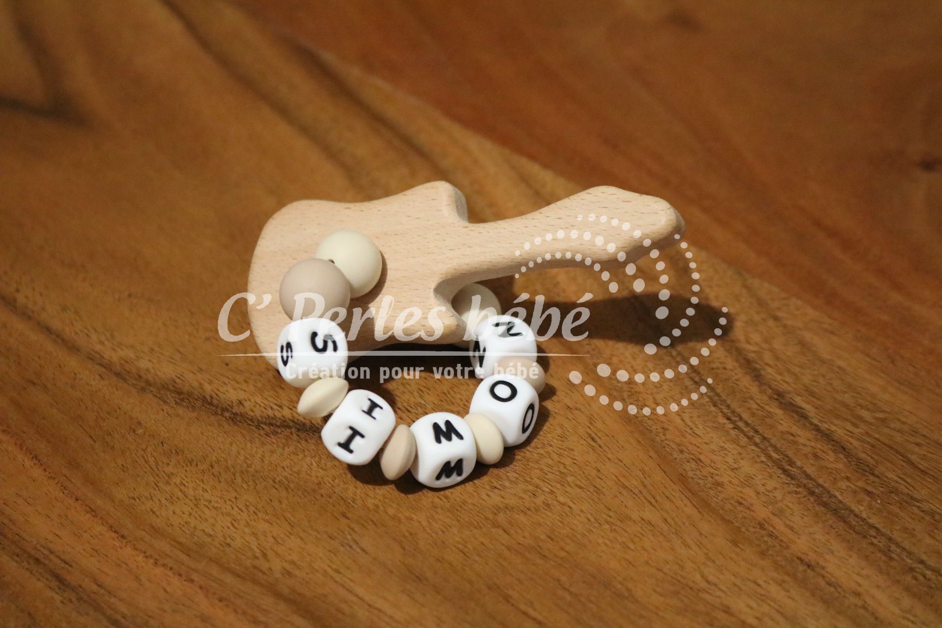 Hochet avec perles en silicone et anneau de dentition en bois, jouet d’éveil et de dentition pour votre bébé.
