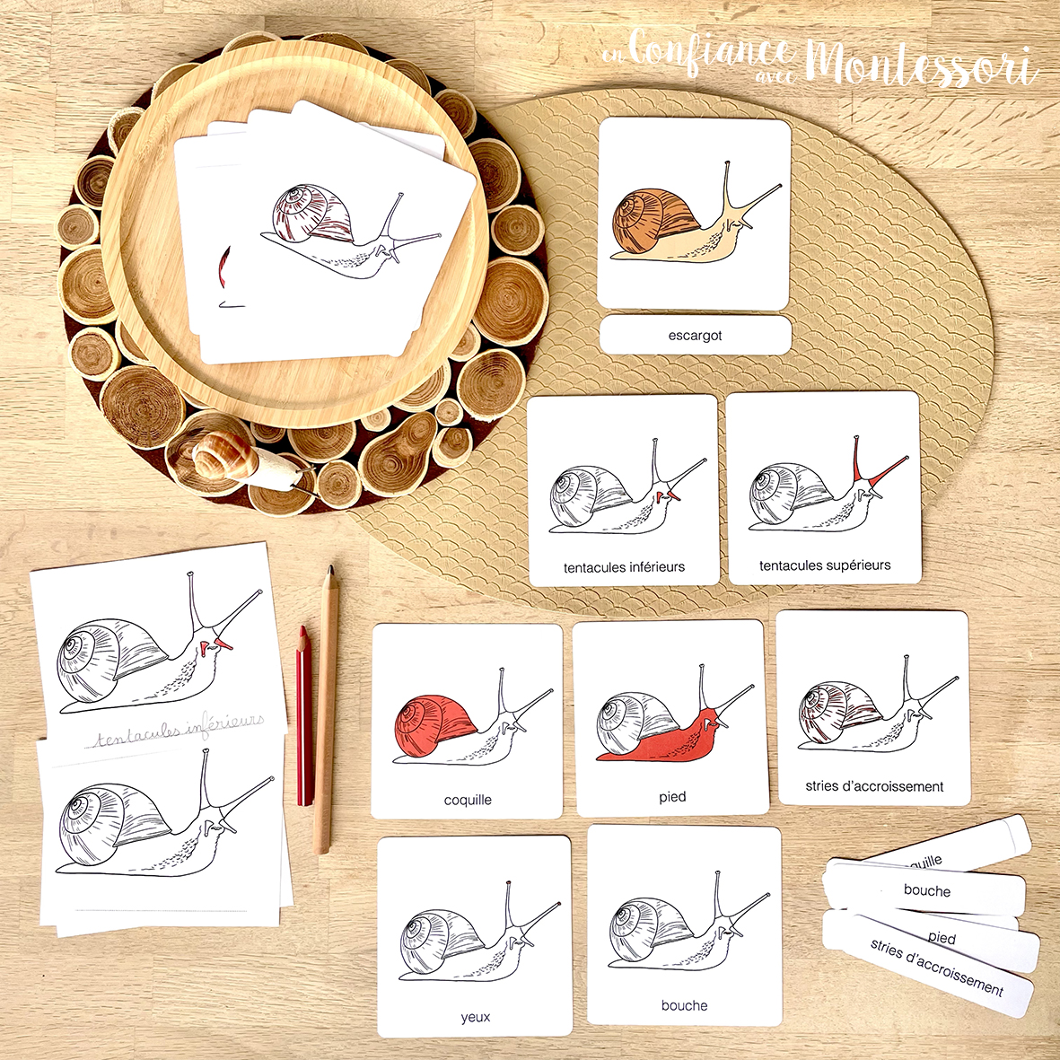 Ce produit contient 1 ensemble d’images classifiées / cartes de nomenclature Montessori sur les parties de l’escargot :