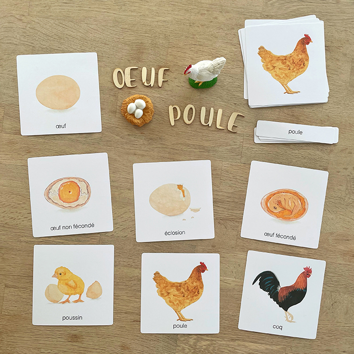 Pour agrémenter les présentations, vous pouvez utiliser les figurines du cycle de vie de la poule si vous les avez.
