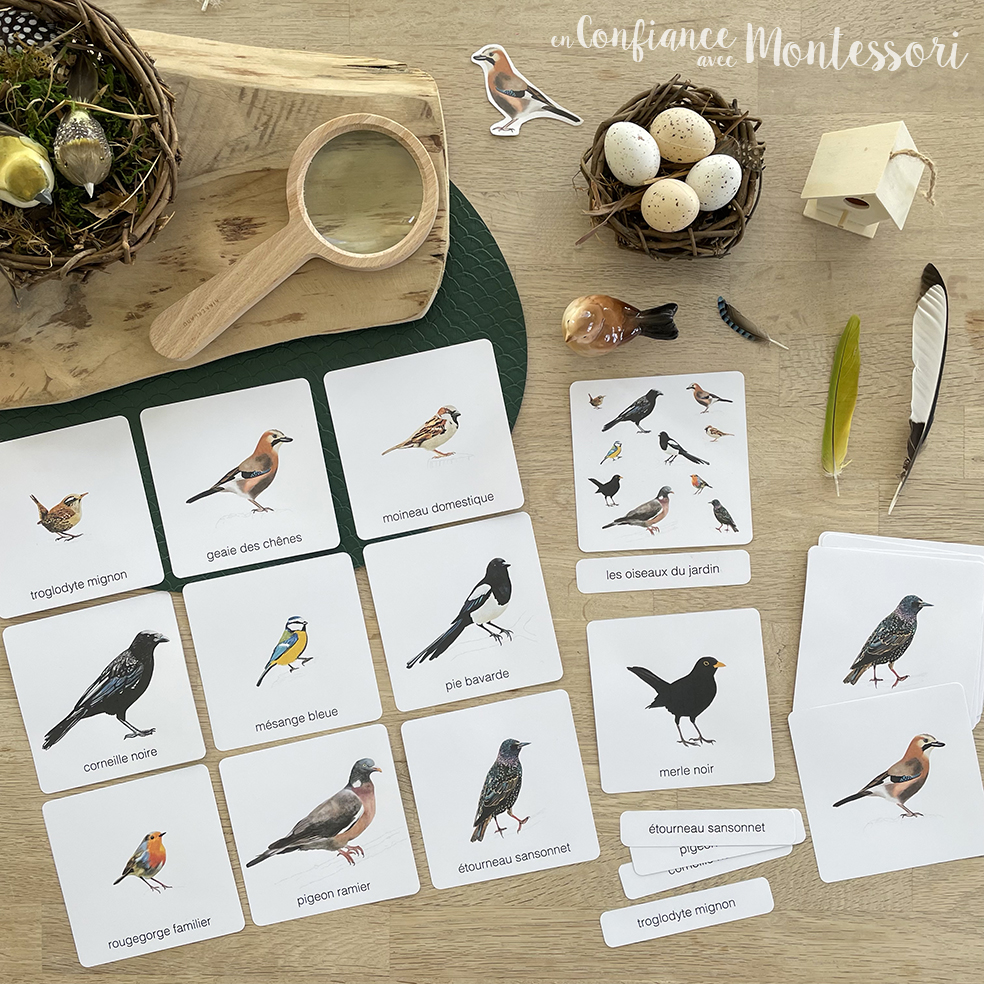 Ce fichier comprend des images classifiées Montessori des différentes espèces d’oiseaux que l’on trouve communément dans nos jardins ainsi que les cartes descriptives des 10 oiseaux abordés. Ce matériel est destiné aux enfants de 3 à 7 ans.