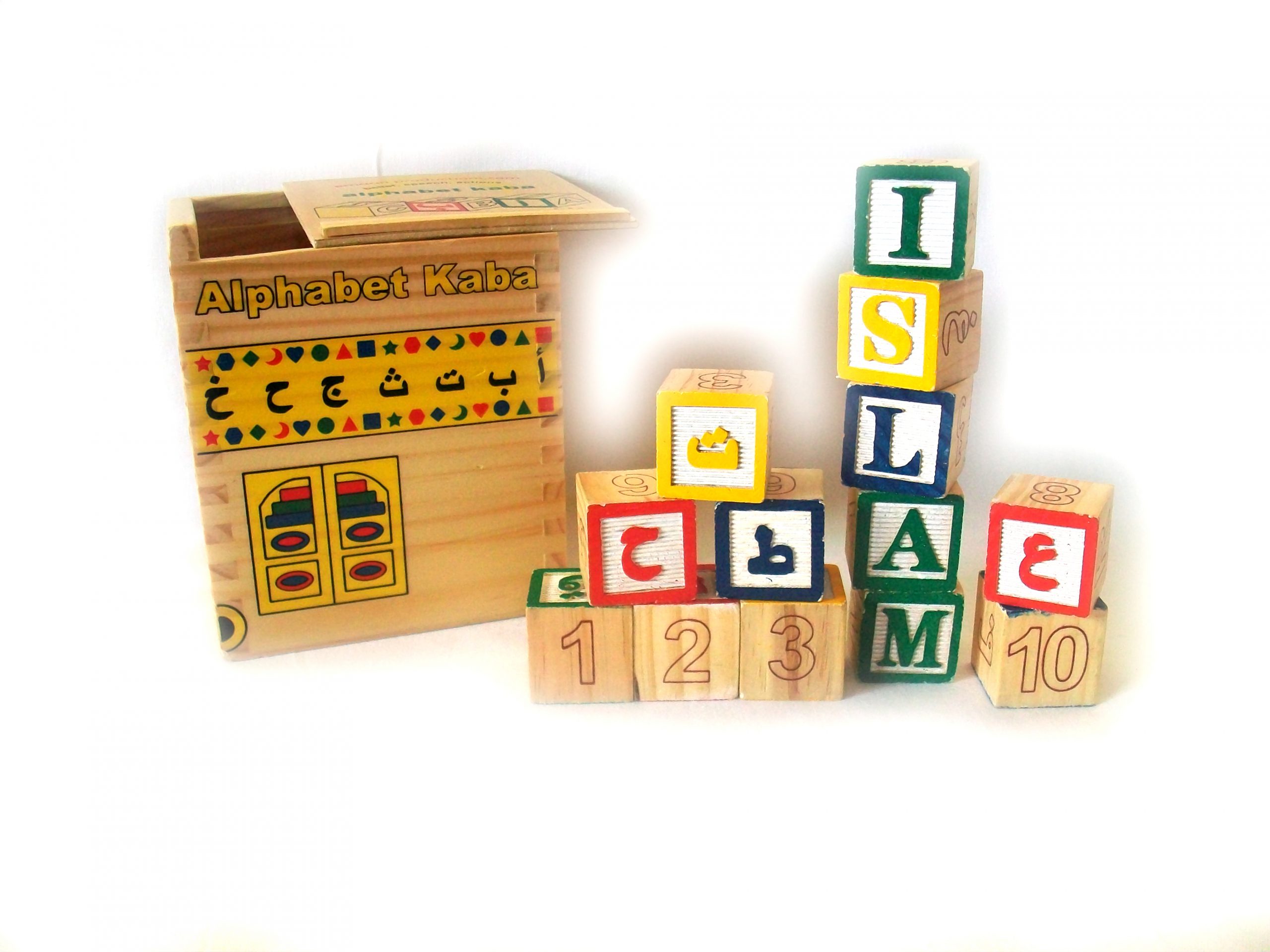La Kaaba Cube Alphabet Arabe est un jeu qui comporte une boîte en bois solide avec 28 petits cubes bilingues en bois (arabe, français, chiffres).
