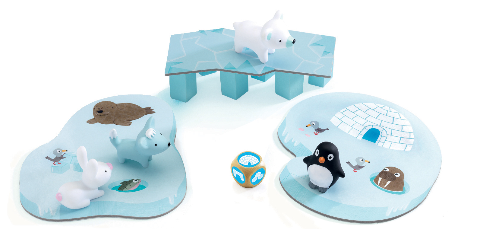 Le jeu se compose de 3 plateaux de jeu (1 plateau de départ « banquise », 1 pont de glace, 1 plateau d’arrivée « igloo »), 6 piliers en bois, 4 animaux en plastique, 1 dé et la règle de jeu.