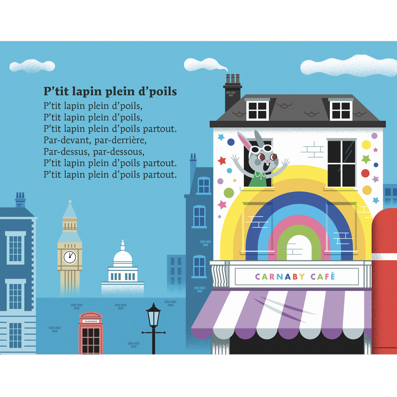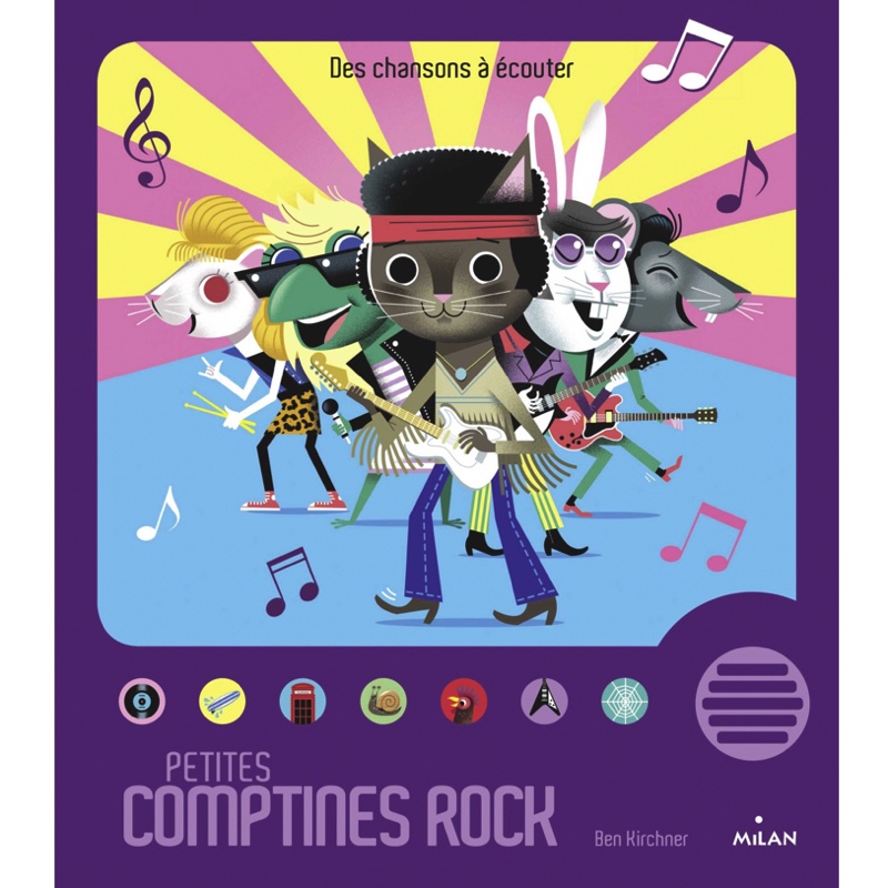 1 grand livre sonore 14 pages, 7 musiques Format 18,5 x 21 cm Dès 3 ans Un livre de comptines très rock’n roll ! 7 comptines adaptées pour découvrir ses premières sonorités rock. À écouter en toute autonomie grâce à un boîtier sonore : « La Famille tortue », « Am stram gram », « P’tit lapin plein d’poils », « Une souris verte », « Une poule sur un mur », « Il court, il court, le furet », « Un éléphant qui se balançait ».