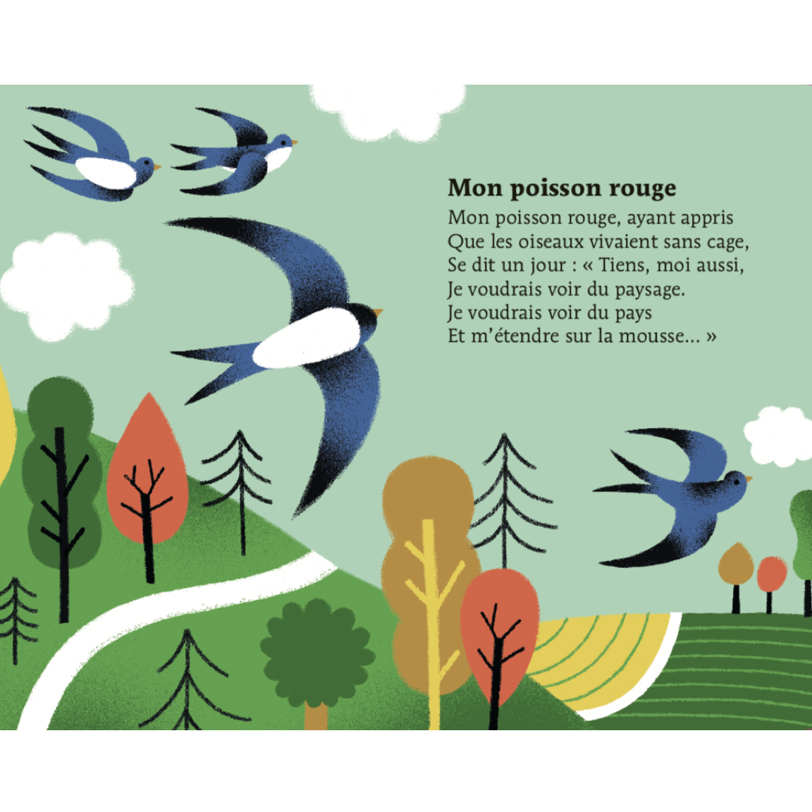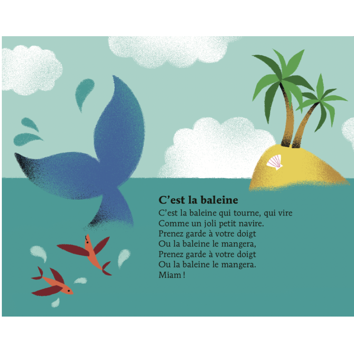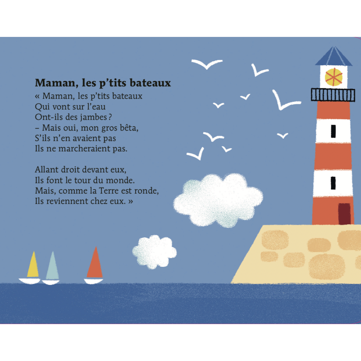 Avec ce livre, les enfants redécouvriront avec plaisir les célèbres comptines marines telles que « Bateau sur l’eau », « C’est la baleine », « Mon poisson rouge », « Il était un petit navire », « Les Petits Poissons dans l’eau », « Maman, les p’tits bateaux », « Un poisson au fond d’un étang ».
