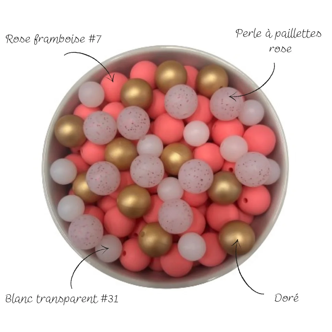 Lot de 10 perles rose à paillettes 15 mm Toutes les couleurs des perles en silicone ont été testées chimiquement dans un laboratoire français et sont sans aucune substance nocive.