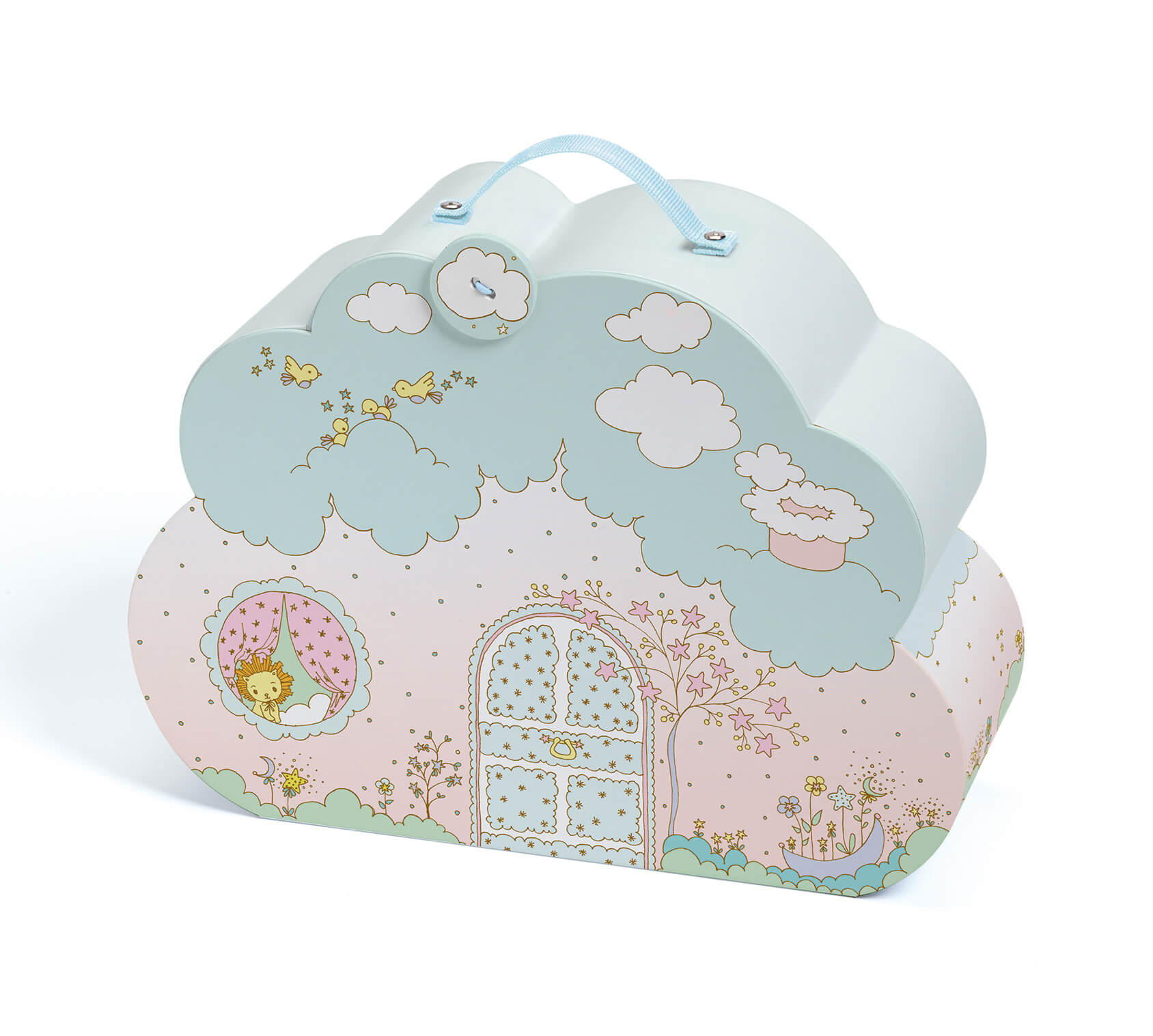 Cette jolie maison représentant un nuage, est facile à transporter grâce à sa poignée. Elle s’ouvre pour y découvrir un décor de maison de poupées. Dans cette valisette, découvrez un intérieur avec une cuisine, des alcôves pour coucher vos figurines et une table pour manger.