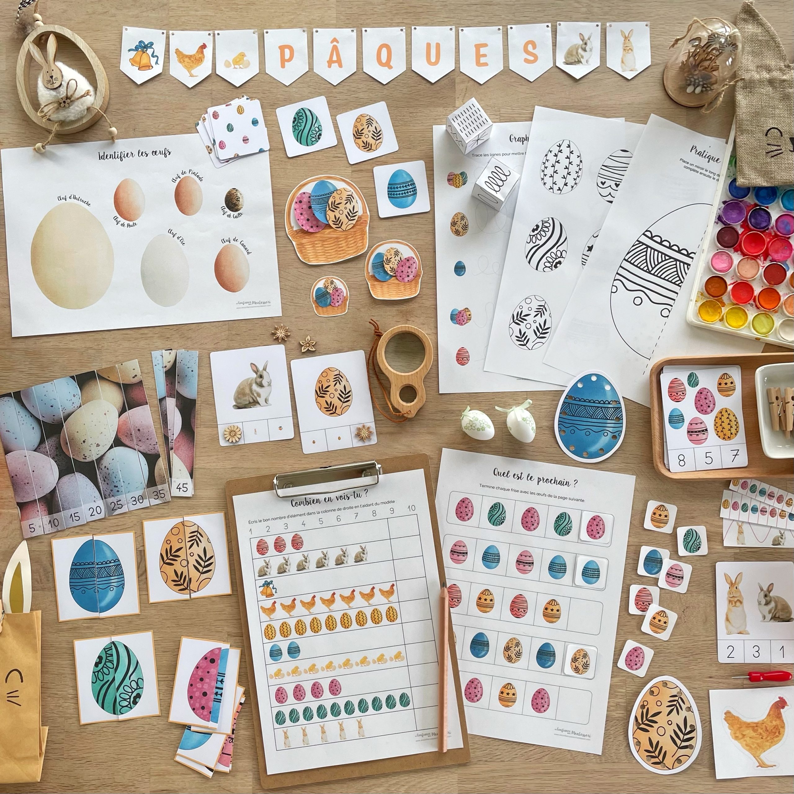 Voici la liste du matériel que vous recevez en choisissant le Pack Poule + le Bonus de Pâques pour un total de 90 pages :