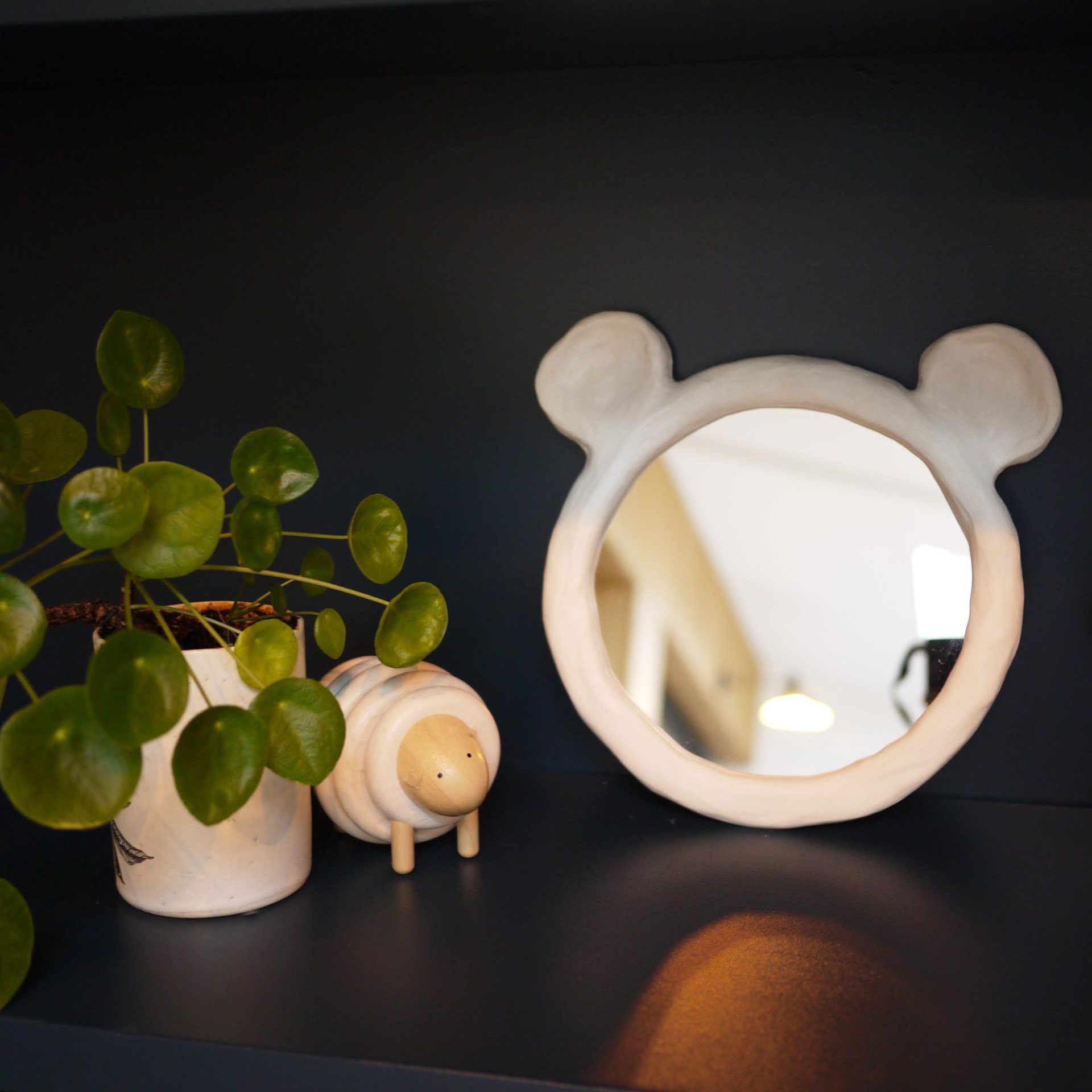 Un miroir artisanal madame « Ourse » idéale dans la chambre de mini et absolument adorable. Façonné à la main dans notre atelier de Nantes des différences minimes peuvent être constater avec le miroir pris en photo. Une mignonnerie unique à accrocher au mur de la chambre de bébé.