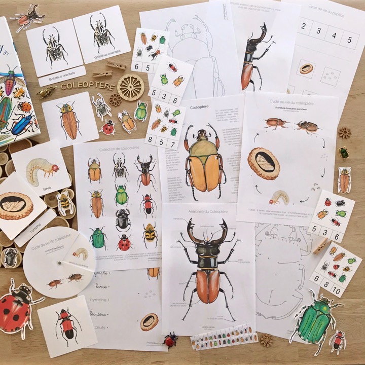 Voici la liste du matériel que vous recevez en choisissant ce pack d’inspiration Montessori sur le thème des coléoptères :