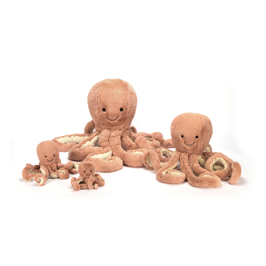 Odell est un poulpe moelleux et ultra-doux au regard malicieux. Cette pieuvre rose de 23 cm possède huit tentacules qui s’enroulent et qui sont faciles à saisir par les petites mains de bébé. Cette adorable peluche séduira petits et grands.