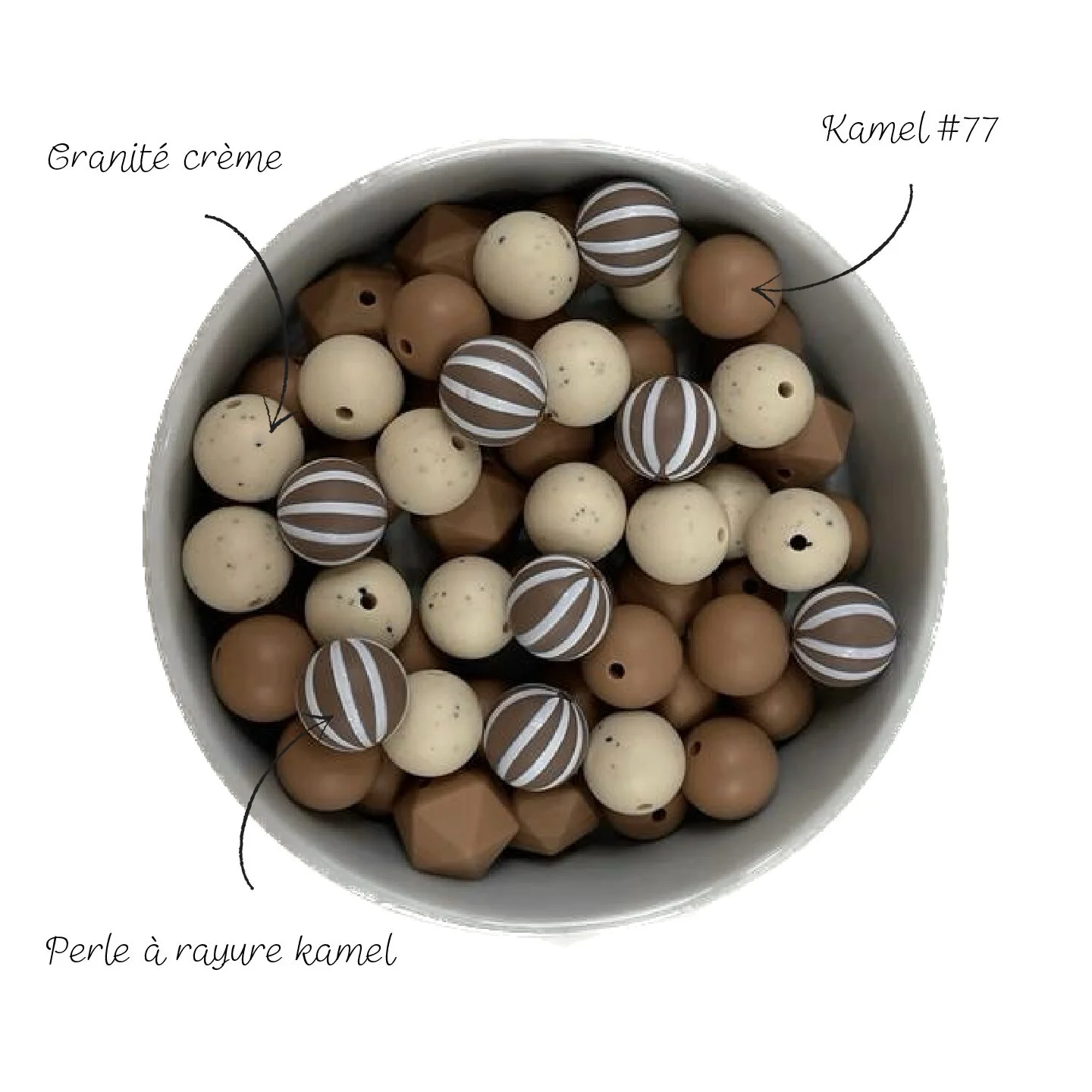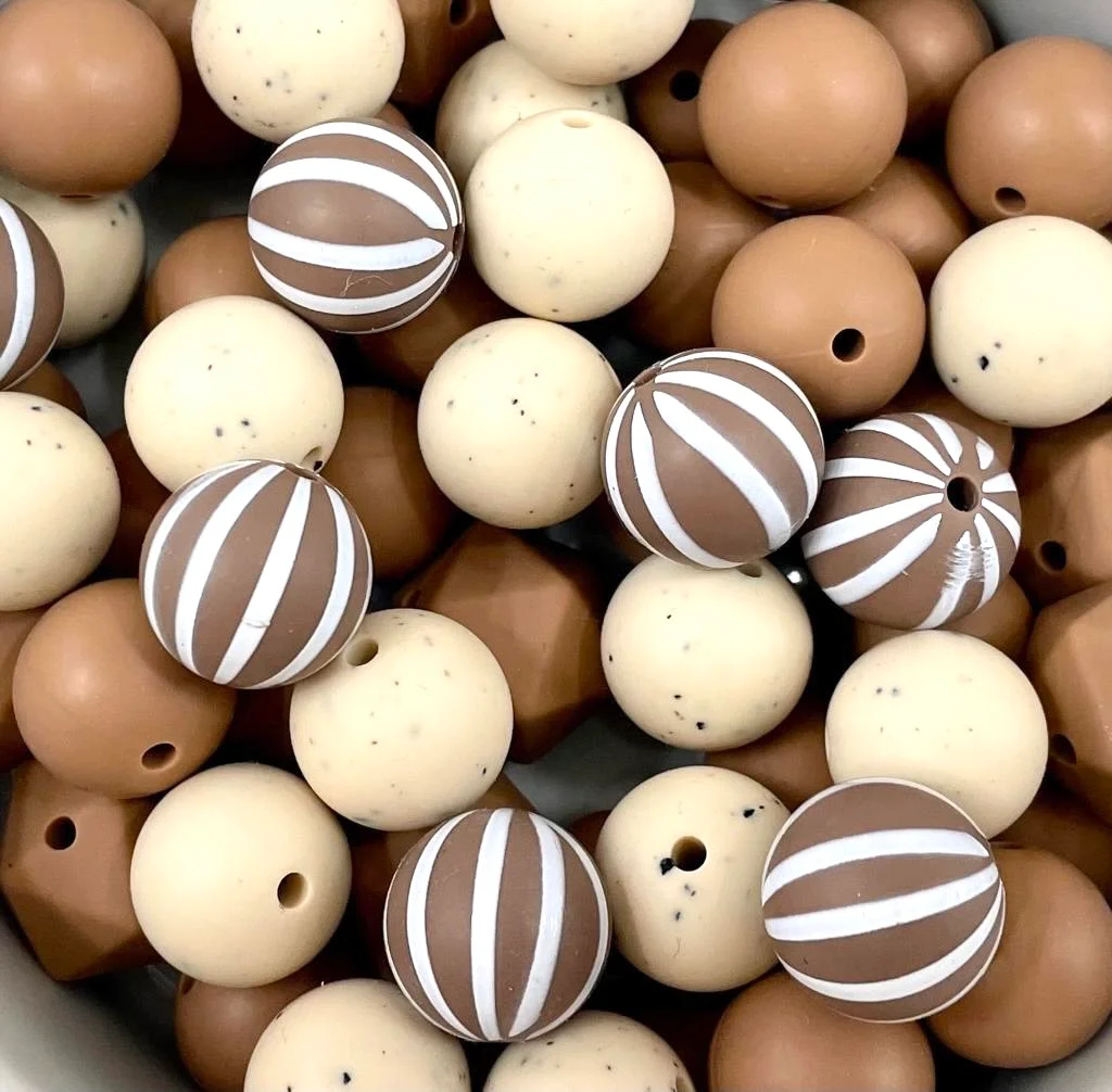 Perle à rayure kamel 15 mm Toutes les couleurs des perles en silicone ont été testées chimiquement dans un laboratoire français et sont sans aucune substance nocive.