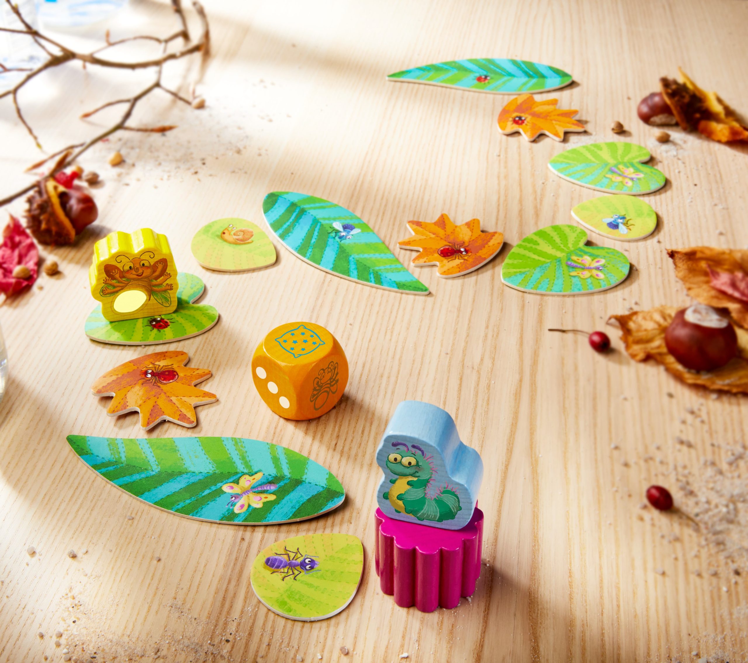 Il y a quelque chose qui brille ! Myrtille la chenille s’étire et découvre Victor le ver luisant quelques feuilles plus loin. Elle voudrait bien jouer avec lui … Qui aura un peu de chance au dé et réussira à courir avec la petite chenille vers le petit ver luisant avant que Victor n’atteigne le bout du chemin de feuilles et ne s’envole ?