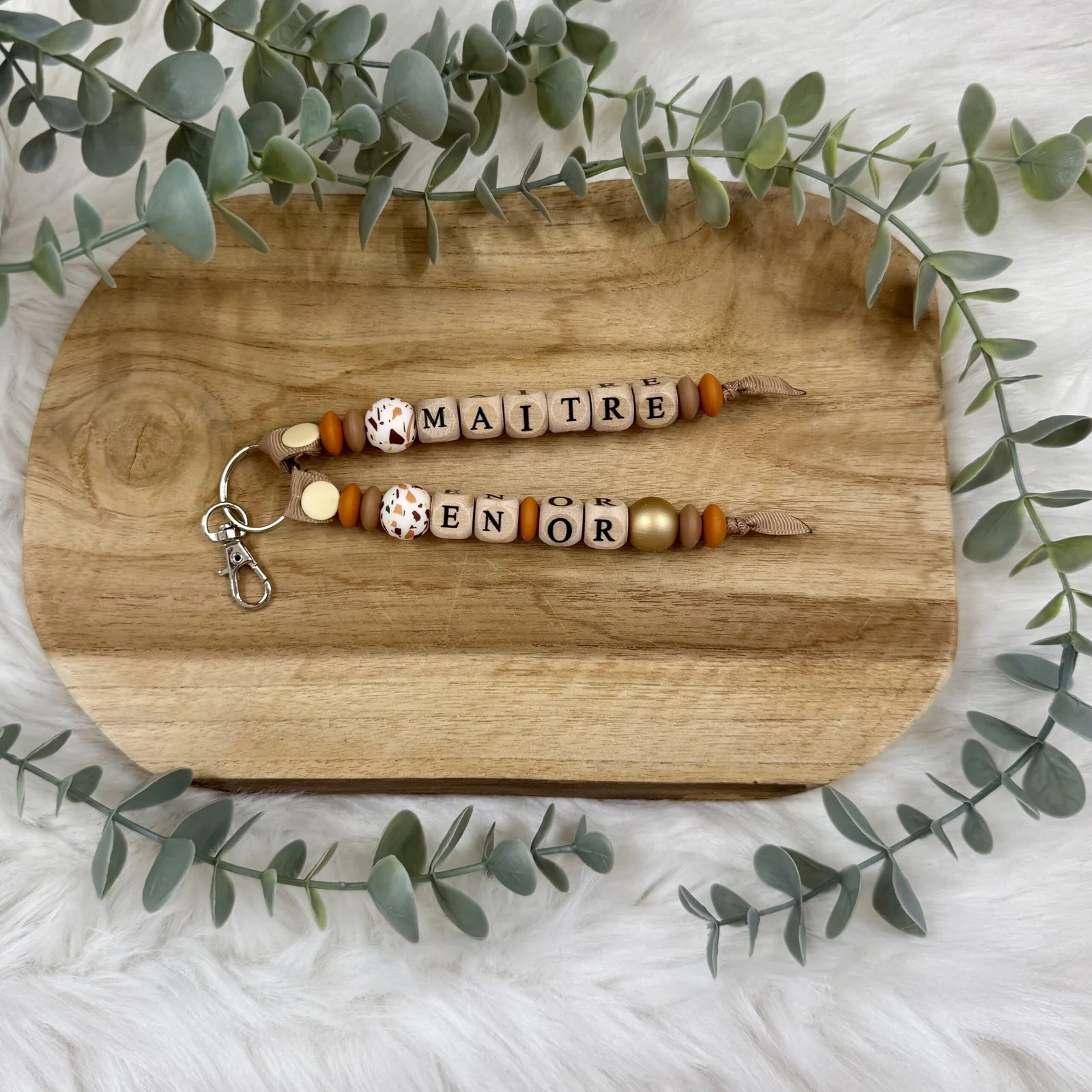 - porte clé : perle plate 12mm kamel et ocre, perle ronde 15mm conféti, lettre en bois marqué noir 12mm, perle ronde 15mm doré