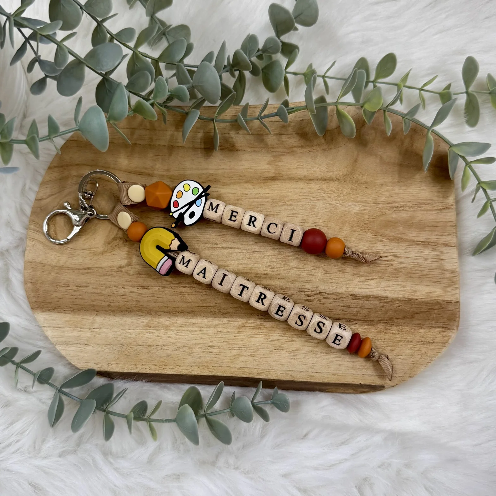 - porte clé : perle fantaisie palette de peinture, perle fantaisie crayon, perle ronde 15mm rouge marsala, perle ronde 12mm ocre, perle lettre bois, perle icosaèdre 14mm ocre, perle ronde 15mm rouge, perle plate 12mm rouge marsala, perle plate 12mm ocre, ruban et pression kamel