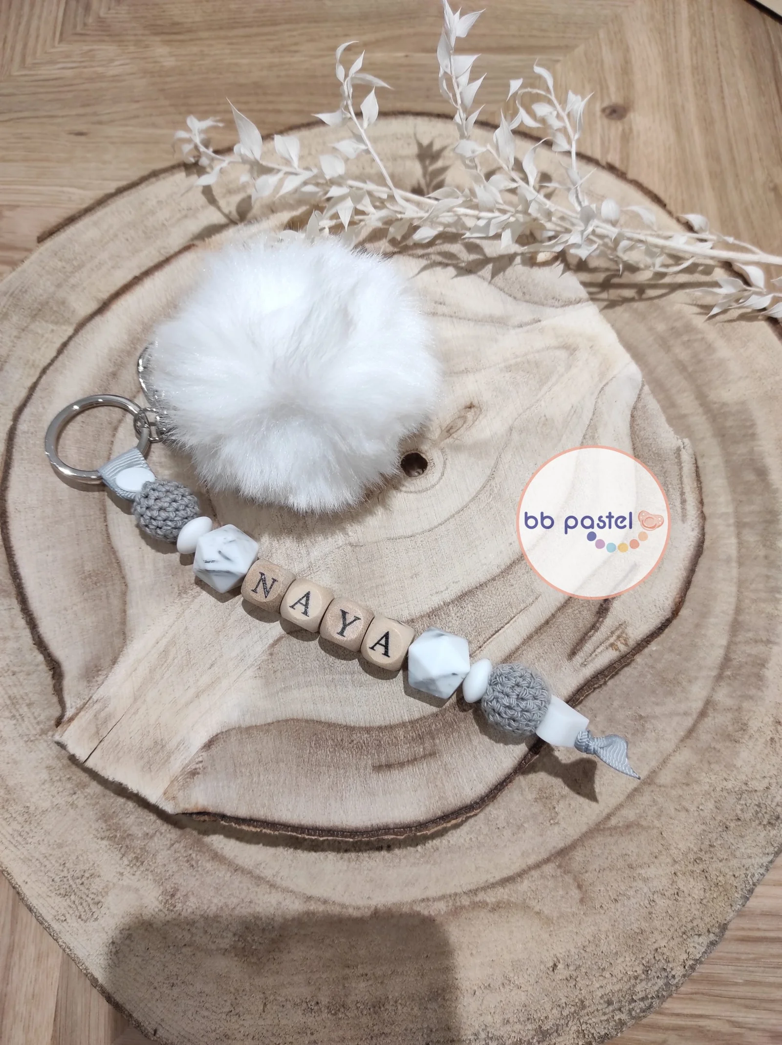 Porte-clés personnalisé 1 prénom. Plus de choix de personnalisation dans les photos d’attache-tétine, les perles utilisées sont les mêmes. Consulter “bbpastel_com” sur Instagram pour suivre toute l’actualité de bb pastel sous forme de Story publiées en temps réel.