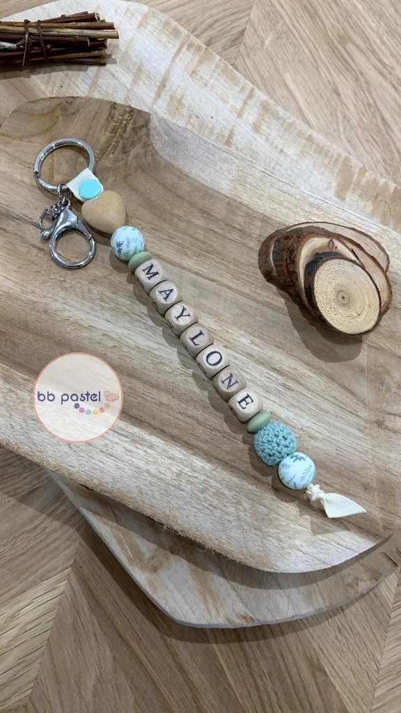 Porte-clés personnalisé 1 prénom. Plus de choix de personnalisation dans les photos d’attache-tétine, les perles utilisées sont les mêmes. Consulter “bbpastel_com” sur Instagram pour suivre toute l’actualité de BBpastel sous forme de Story publiées en temps réel.
