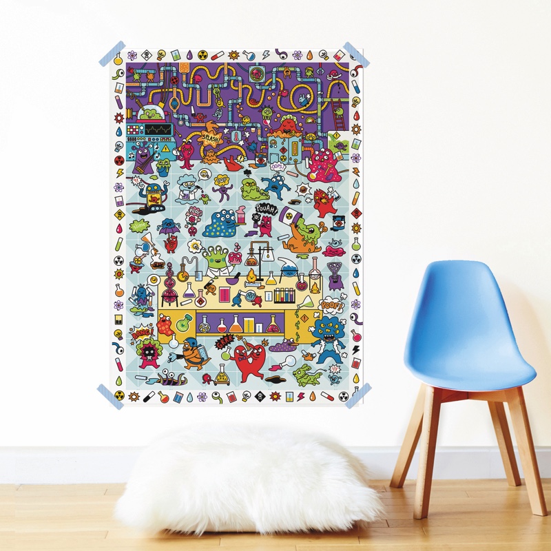 Avec ce poster créatif très rigolo, dans l’univers d’un laboratoire scientifique, l’enfant se plonge dans un monde coloré et joyeux, il colle lui-même les affreux petits montres pour composer un grand paysage déjanté. L’aide d’un adulte n’est pas nécessaire en général, car les enfants apprécient de faire par eux-mêmes. Cette activité est aussi adaptée aux enfants qui ne sont pas manuels.