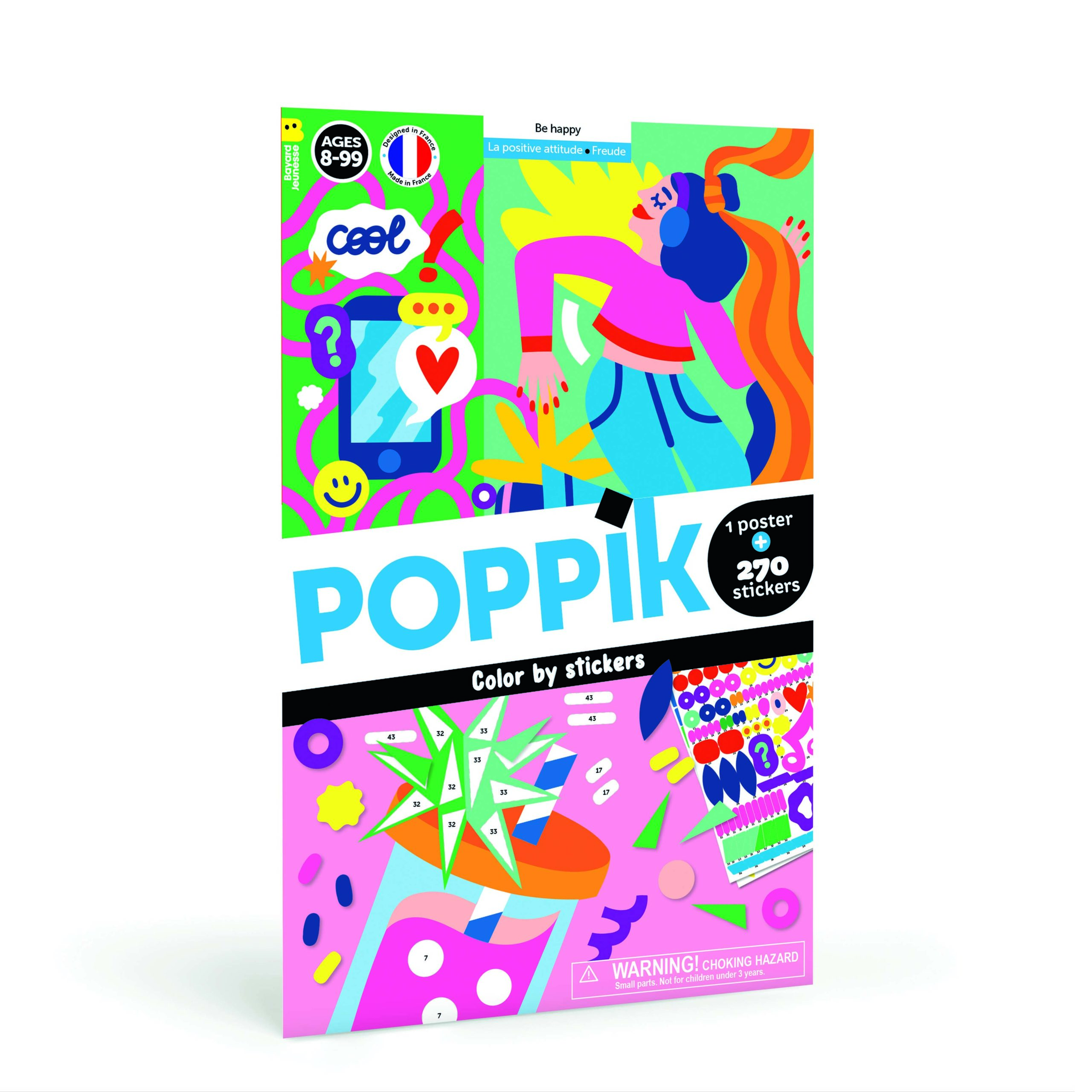 Contient : 1 poster Be Happy ! (50 m x 70 cm) 270 stickers Be Happy ! repositionnables Sur le poster : légendes explicatives bilingues français / anglais Tous publics dès 8 ans Design : Piment Martin Le poster BE HAPPY ! parfait à afficher au-dessus du lit Avec ce poster Be Happy ! à l’ambiance ultra colorée et vitaminée, les enfants vont décorer leur chambre dans une atmosphère de positive attitude. En collant un à un les 270 stickers numérotés, l’enfant va progressivement faire apparaître une œuvre d’art.