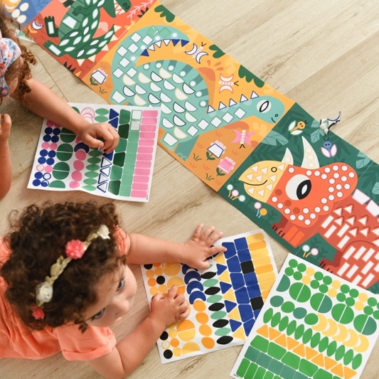 Contient : 1 poster dinosaures (140 x 25 cm) 520 gommettes repositionnables Dès 3 ans Design : Marion Billet Des gommettes dinosaures spécial maternelle Les enfants collent les gommettes sur un grand décor représentant des dinosaures. En collant les gommettes, ils apprennent ainsi à reconnaître les formes et les couleurs comme en maternelle. Une activité facile pour s’occuper à la maison, se concentrer et s’appliquer !