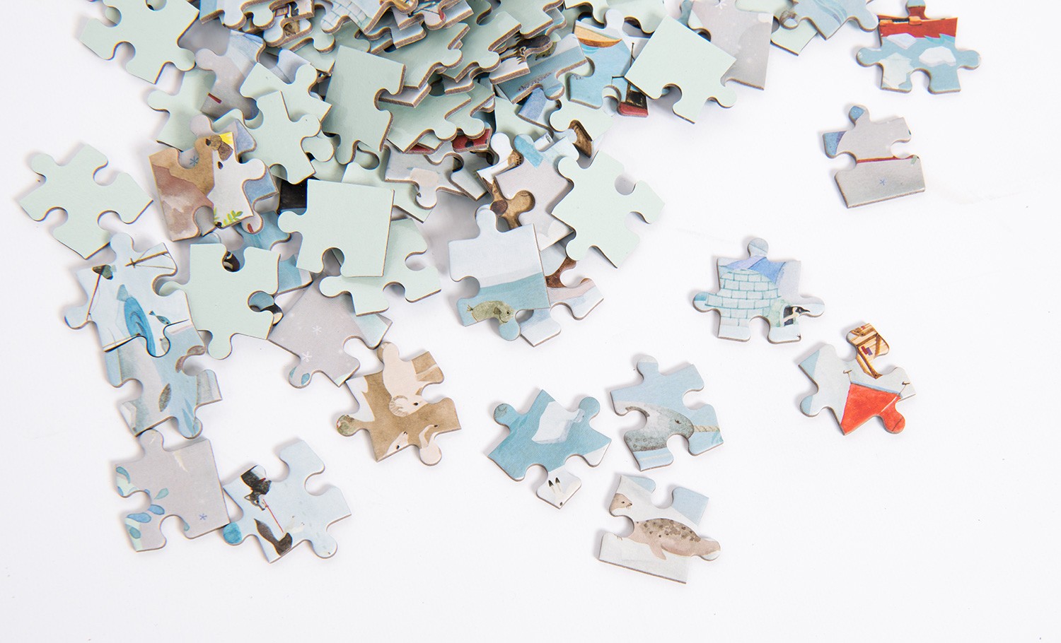Ce puzzle de 96 pièces illustre à l’aquarelle les fabuleux animaux de la banquise. Le puzzle est rangé dans un joli tube illustré où l’on retrouve un poster avec un imagier au dos, et une loupe pour observer la scène de plus près !
