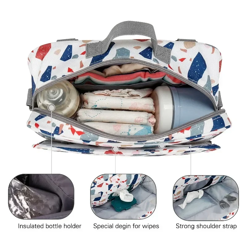 Ce sac à langer multicolore offre un rangement optimal grâce à sa conception intelligente. Son espace intérieur généreux et ses multiples poches permettent de garder tous les essentiels organisés : biberons, couches et accessoires sont facilement accessibles, rendant chaque sortie en famille simple et agréable.