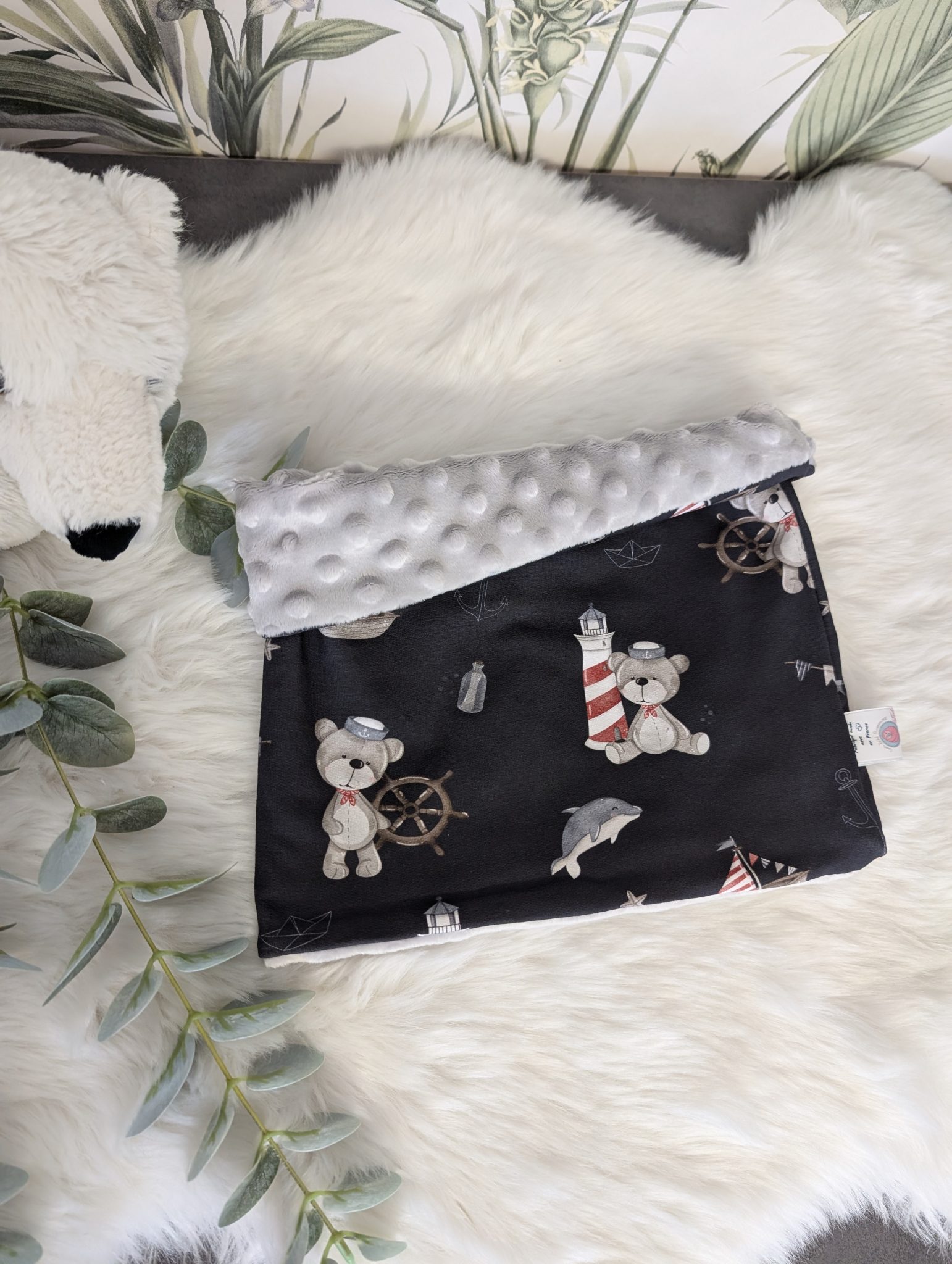 Le snood est un tour de cou qui permet au bébé, enfant ou adulte de maintenir son cou au chaud tout l’hiver, c’est un accessoire indispensable. Idéal pour offrir ou se faire plaisir Tissu exclu marin fond bleu foncé/ Minky gris clair