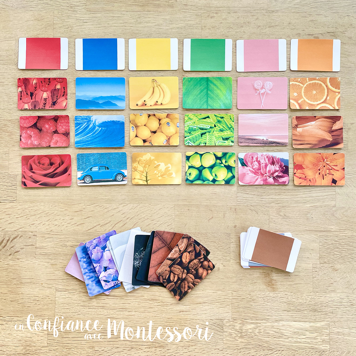 11 couleurs représentées : rouge, bleu, jaune, blanc, noir, gris, orange, vert, violet, rose et marron. Les couleurs sont identiques au matériel Montessori réel.